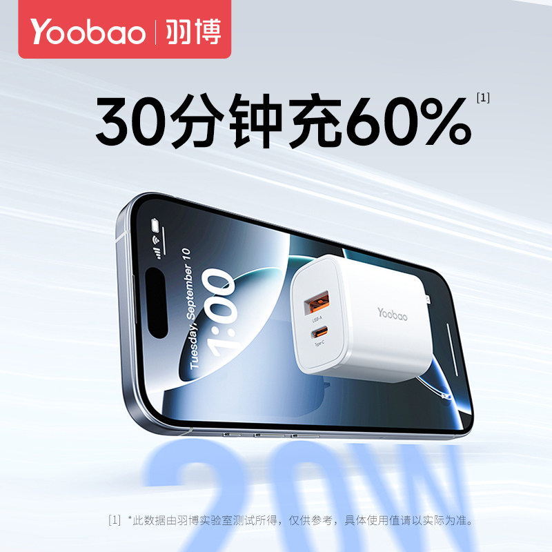 羽博充电头20W快充头迷你typec充电器适用华为iPhone16苹果15手机pd小巧便携双口通用yoobao多口充电插头套装