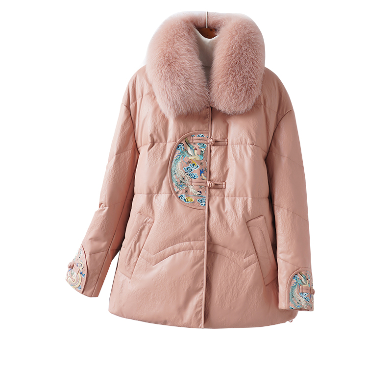 绵羊皮羽绒女常规狐狸毛领新中式盘扣真皮外套90白鸭绒海宁皮衣