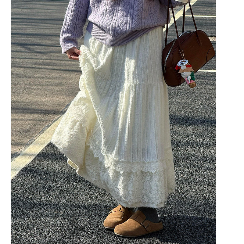 白色蕾丝拼接蛋糕裙女春秋季2026新高腰半身裙温柔风蓬蓬a字长裙