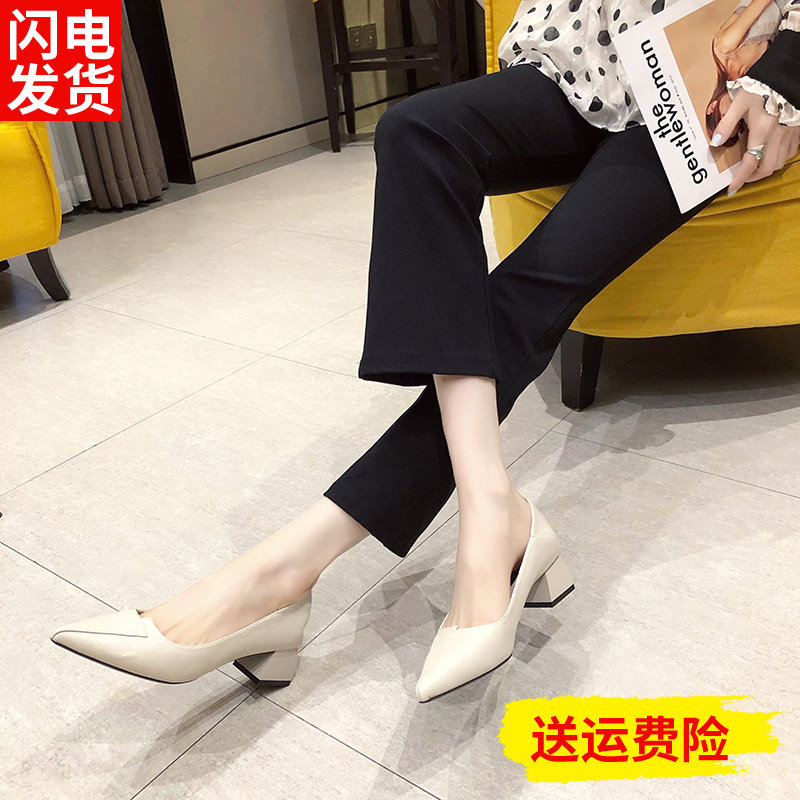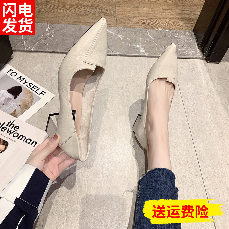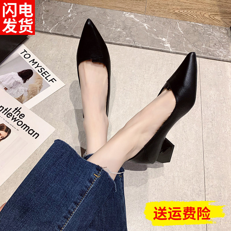 3cm低跟软皮小高跟鞋女粗跟春秋黑色职业工作5公分中跟尖头单鞋子
