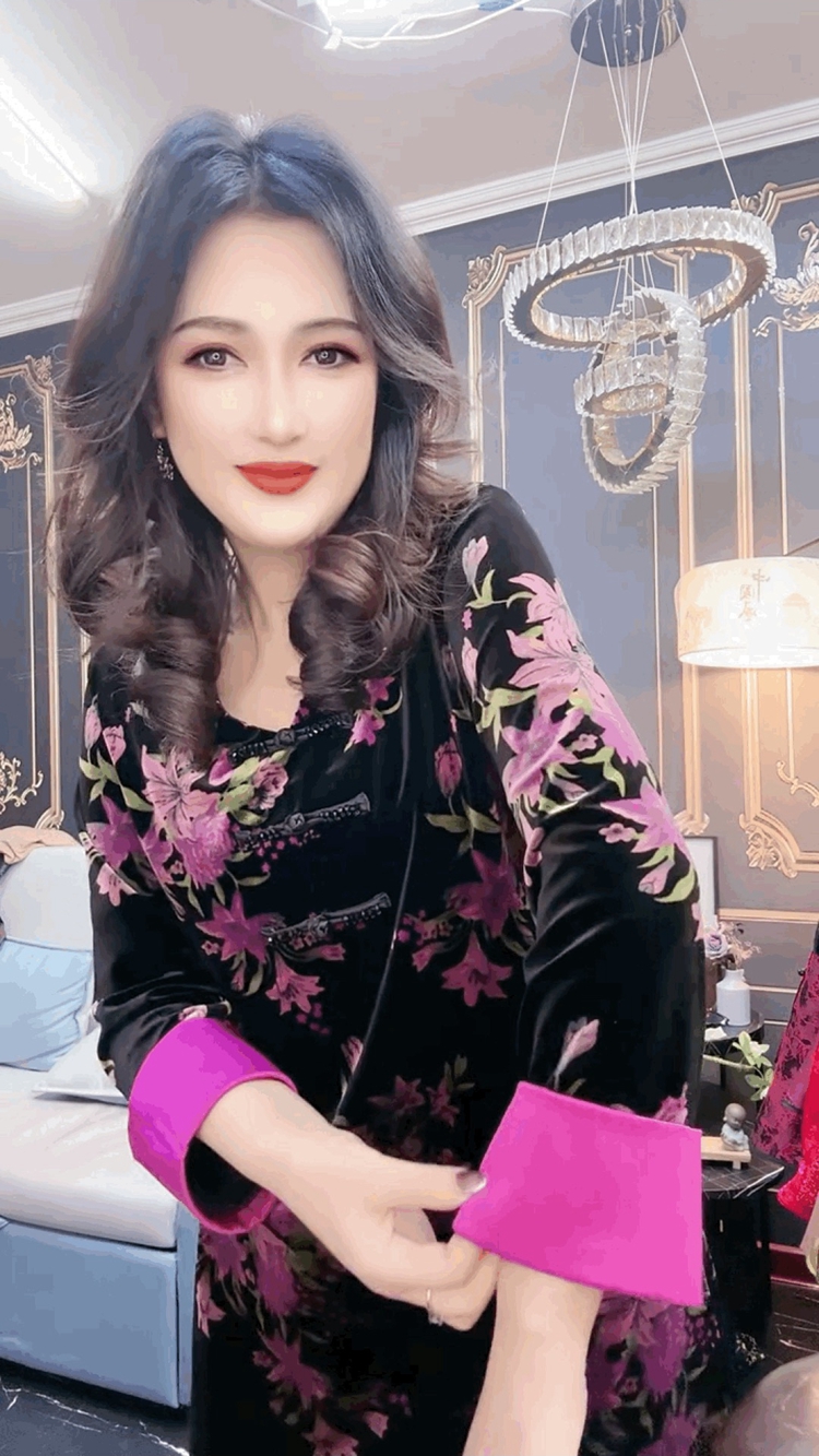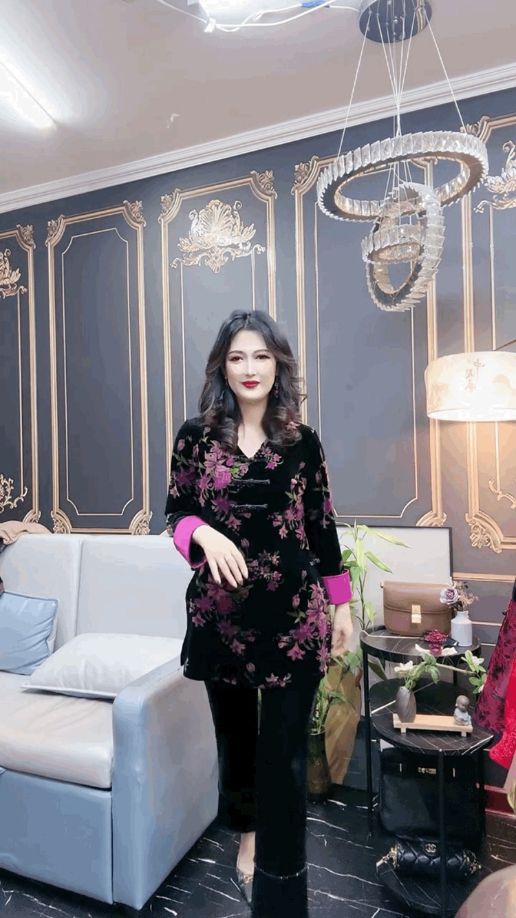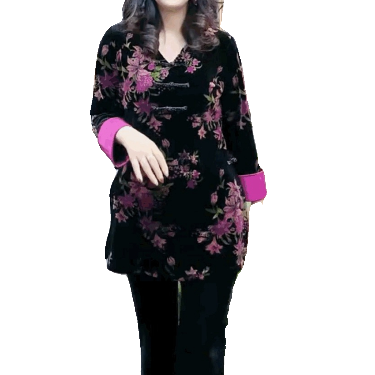 金丝绒碎花盘扣中长款T恤女高级开叉打底衫洋气V领丝绒复古上衣潮