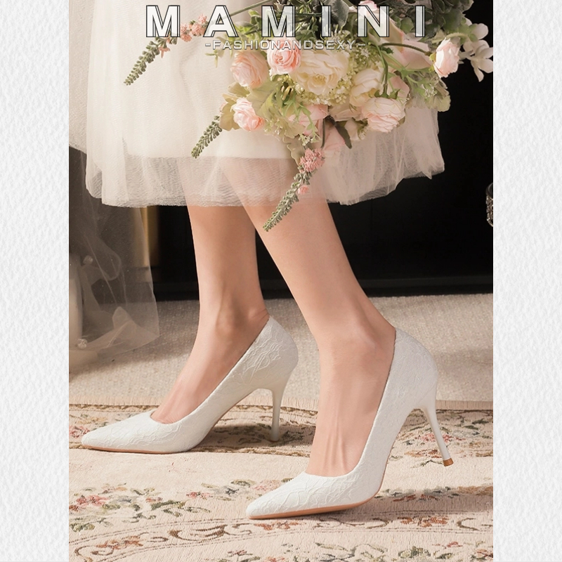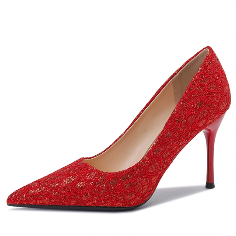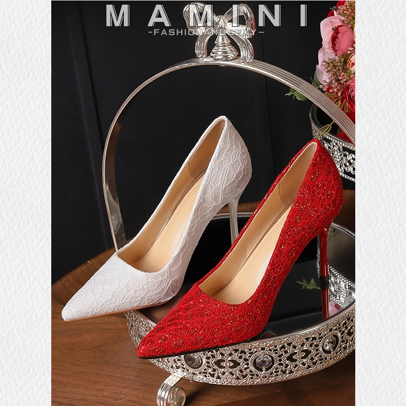 【玛美妮】大码小码婚鞋31-43红色蕾丝伴娘高跟鞋女尖头细跟新款