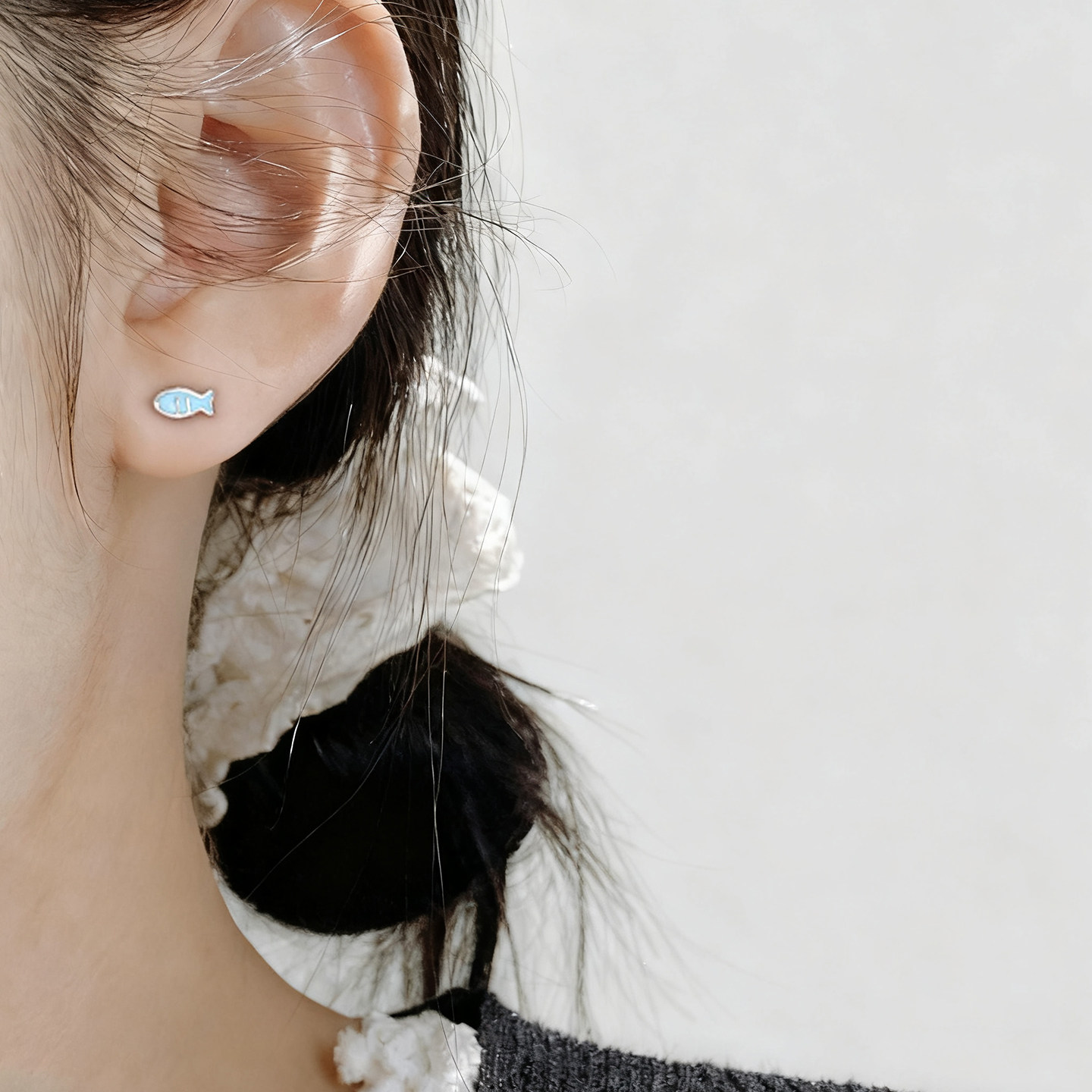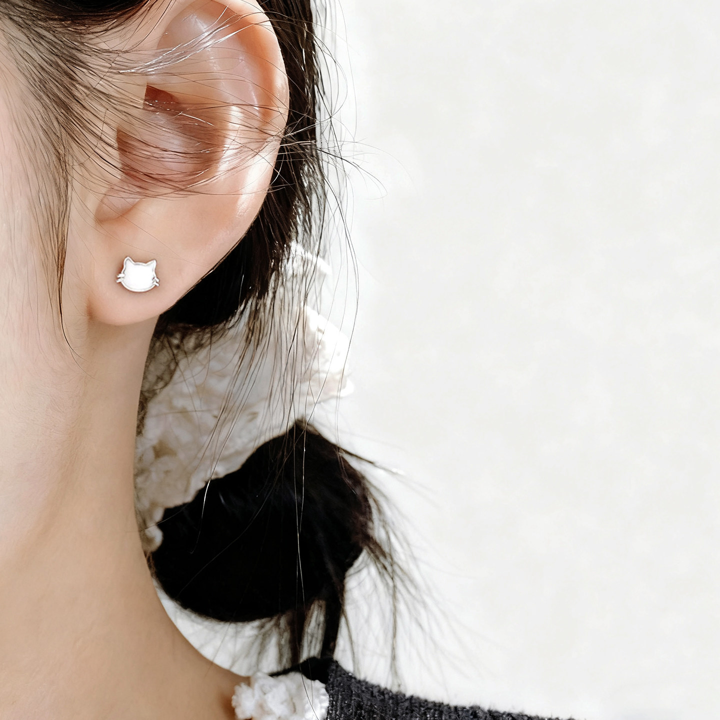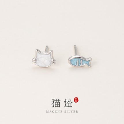 猫蛰S999足银猫与鱼耳钉清纯甜美可爱女纯银耳饰品精致小众设计感