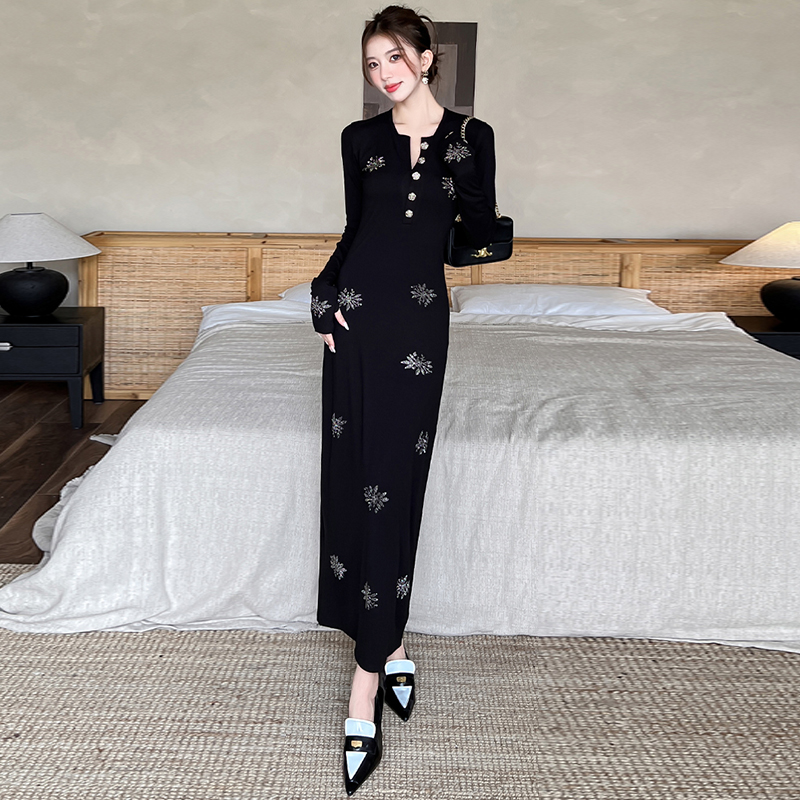 秋冬款长袖打底裙V领性感包臀裙轻熟风修身气质小众高级感连衣裙