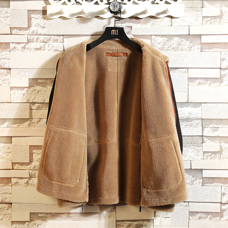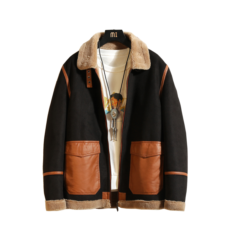 皮毛一体男士夹克冬季外套青年短款潮翻领羊羔毛加绒加厚拼色棉衣