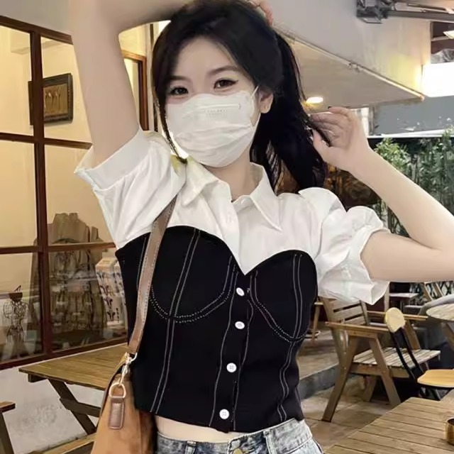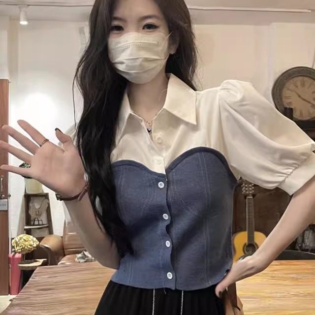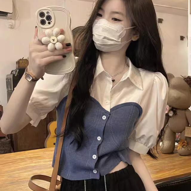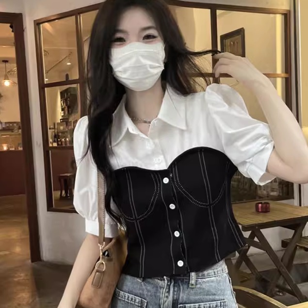 港味风格泡泡袖撞色假两件短袖衬衫女夏季新款小众T恤拼接上衣潮