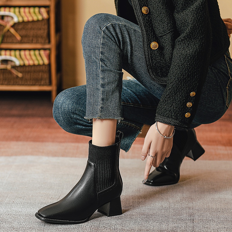 马丁靴女弹力靴2025年冬季新款中跟针织短靴方头粗跟百搭瘦瘦鞋子