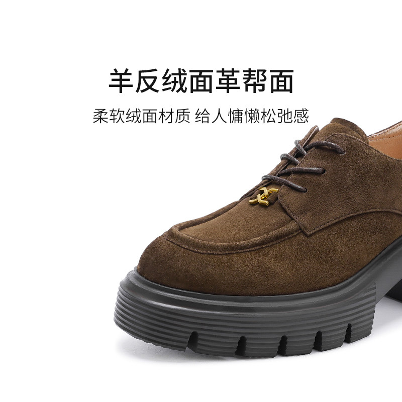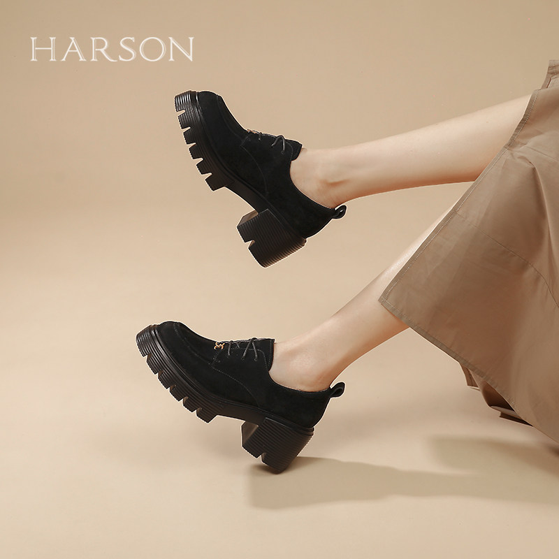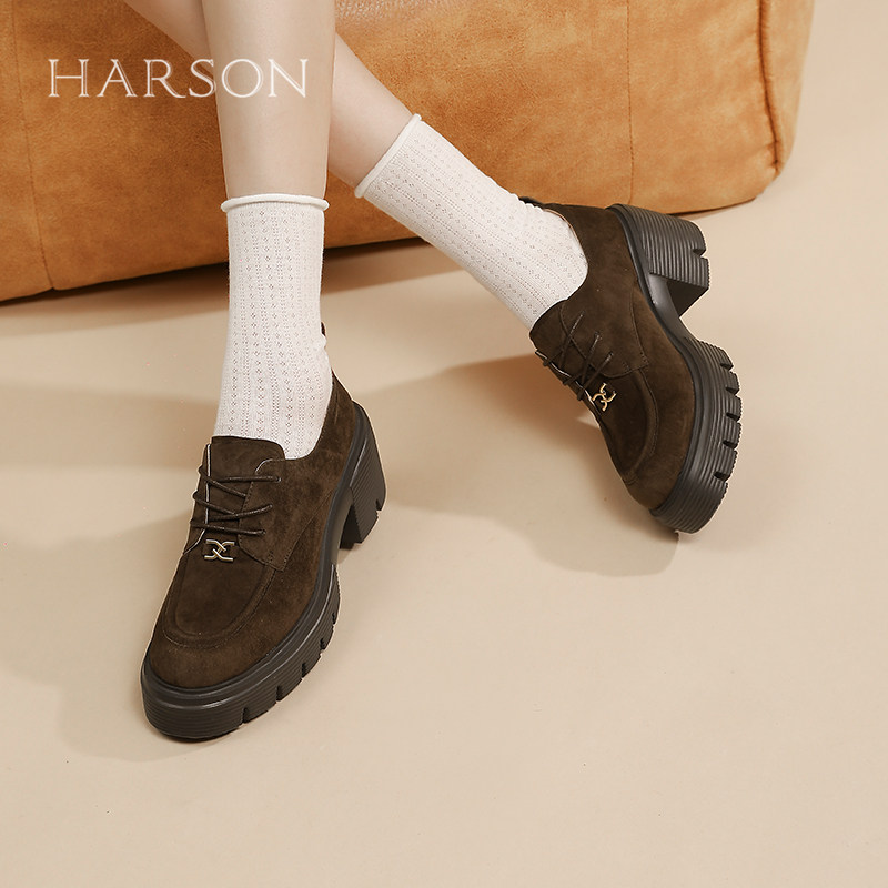哈森时尚深口单鞋2026新款秋季粗跟厚底羊反绒小皮鞋女鞋HL257701