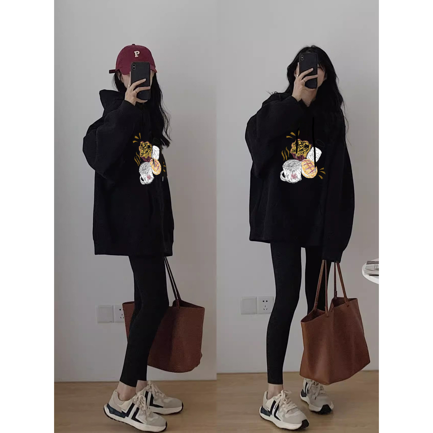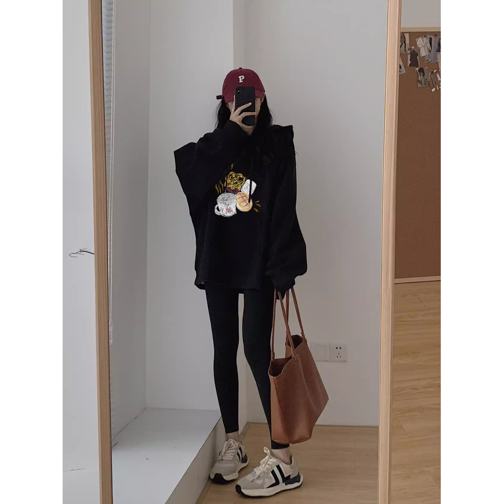 黑色加绒卫衣女款2025新款帽衫连帽大码胖mm显瘦配鲨鱼裤的上衣女