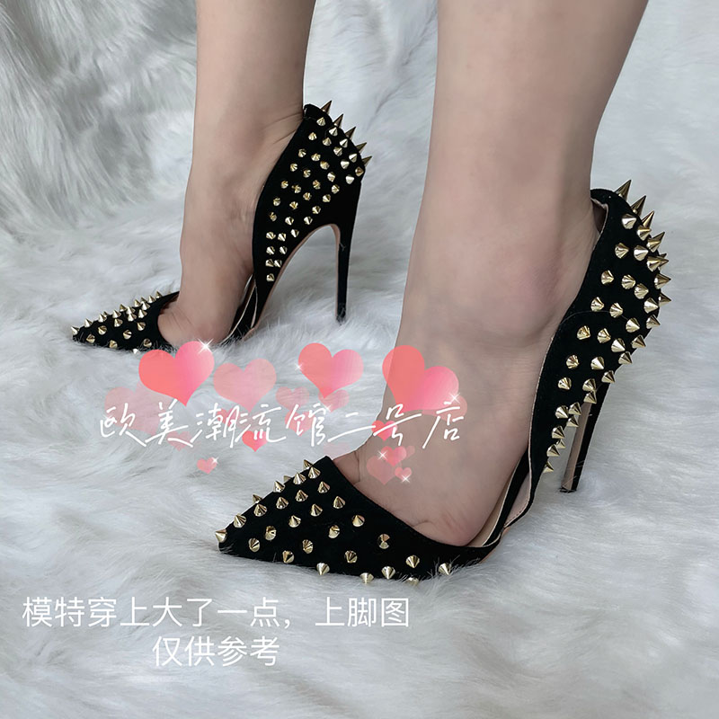 外贸女鞋黑色反绒金色铆钉性感中空露趾大码小码男女细跟高跟单鞋