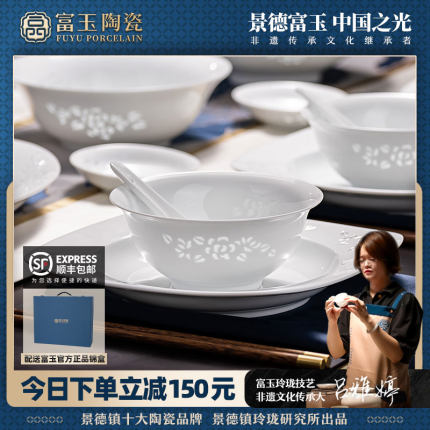 富玉陶瓷景德镇釉下彩餐具套装碗盘家用轻奢高级感纯白瓷玲珑碗碟
