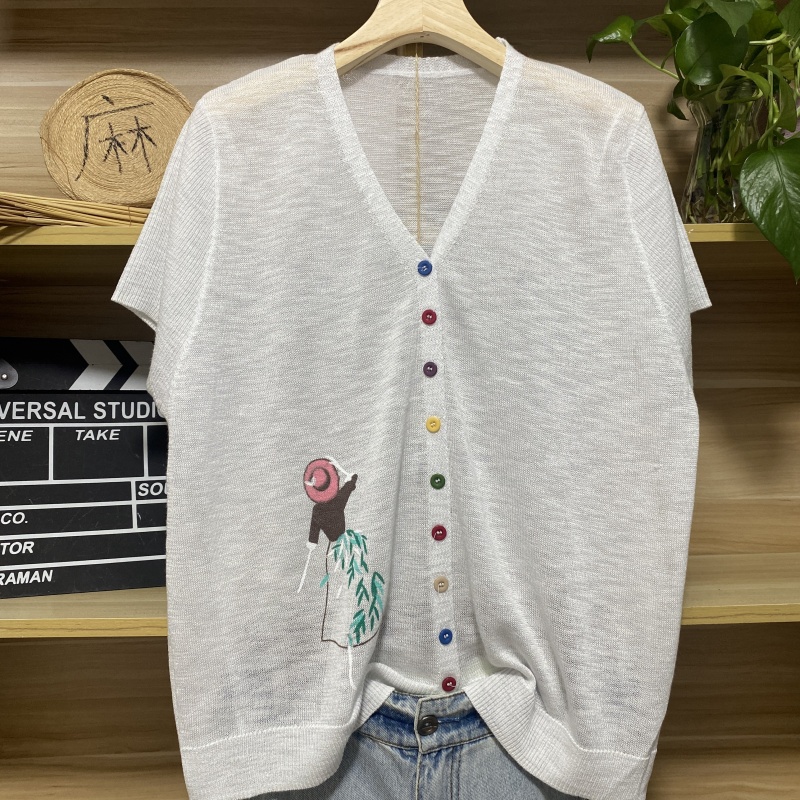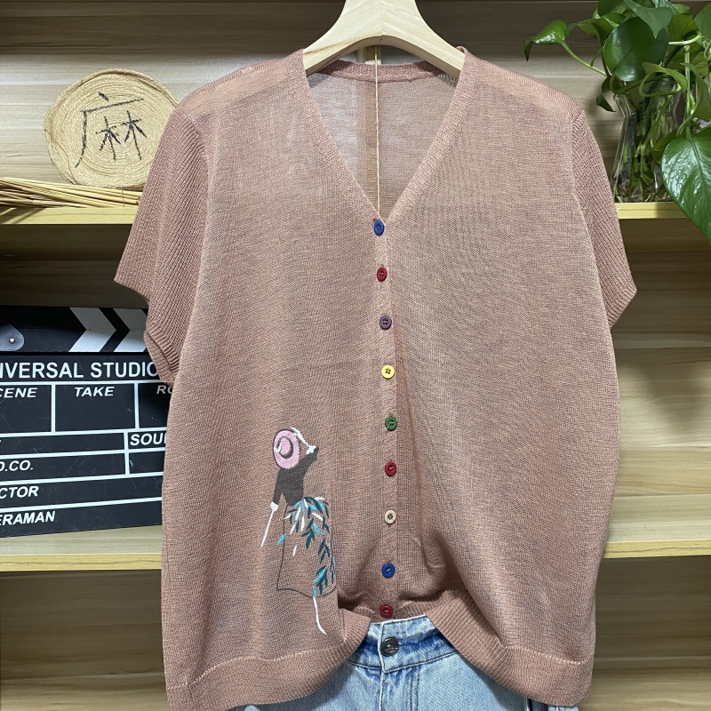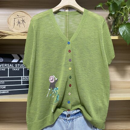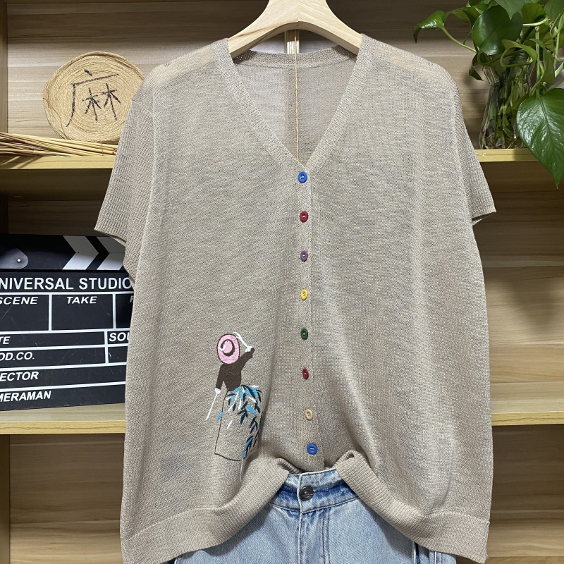 2025新款女装夏装亚麻短袖v领印花开衫上衣宽松大码薄款针织衫女