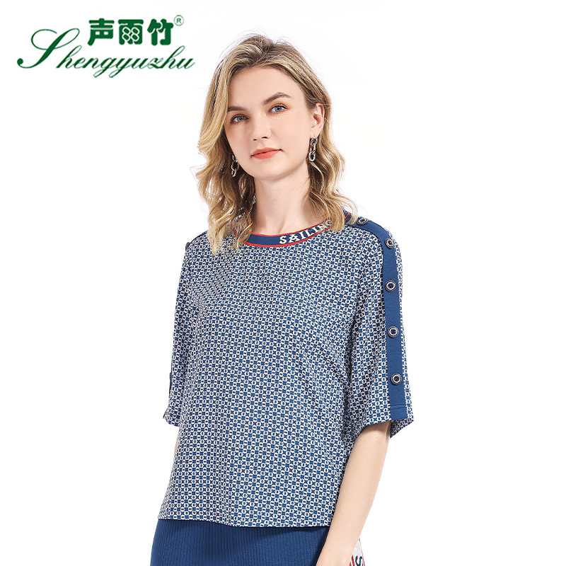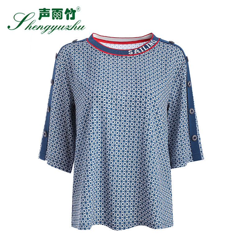 声雨竹官方旗舰店夏季新款T恤女圆领中袖五分袖甜美时尚纯色百搭