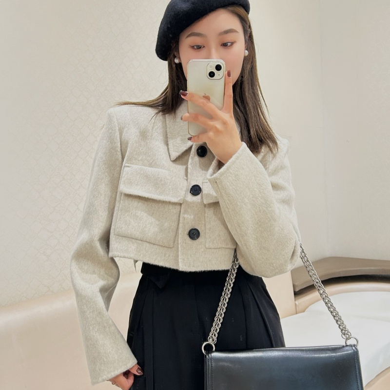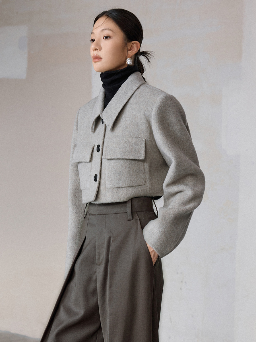 COLINE同款小个子骆驼绒双口袋翻领短款夹克双面呢羊绒大衣外套女