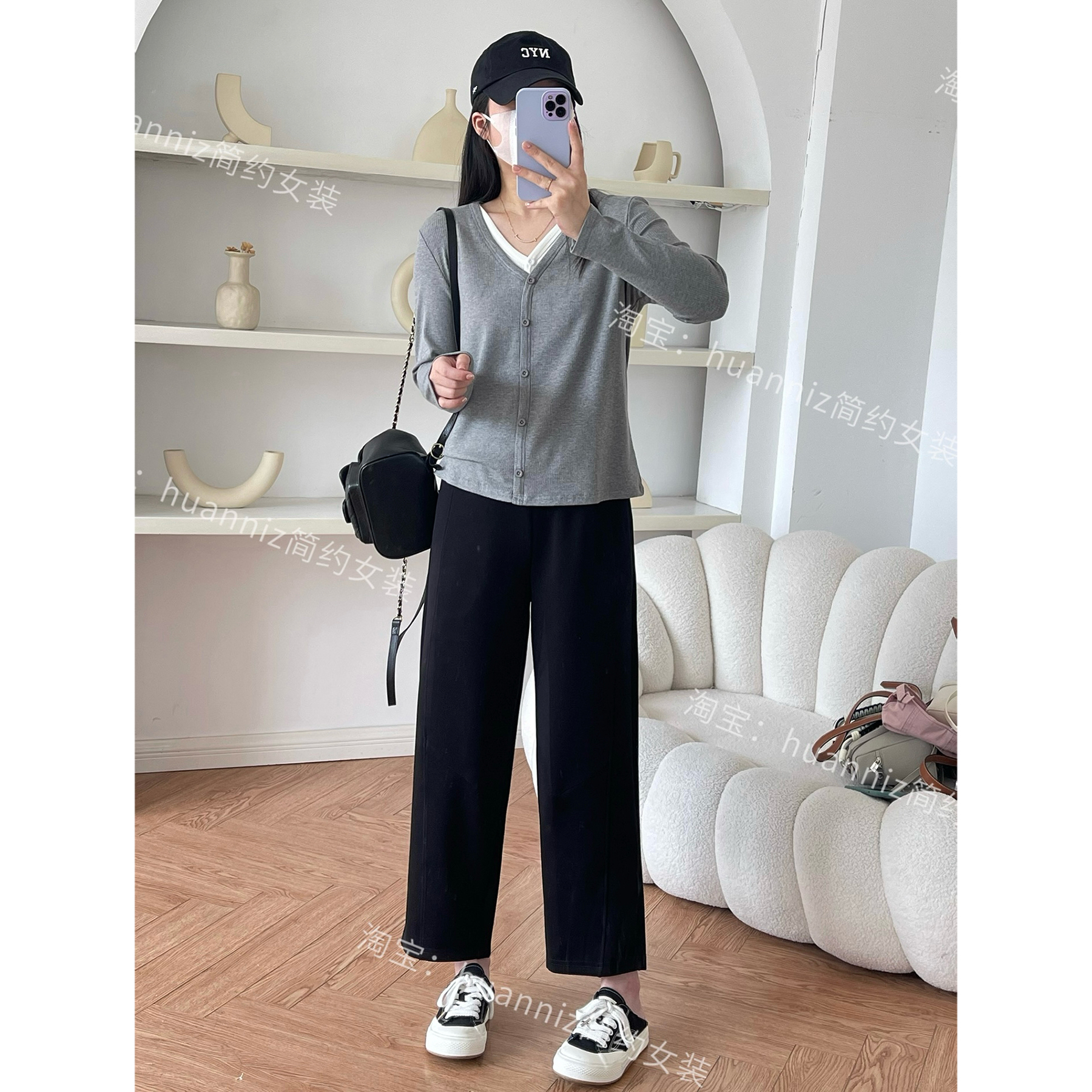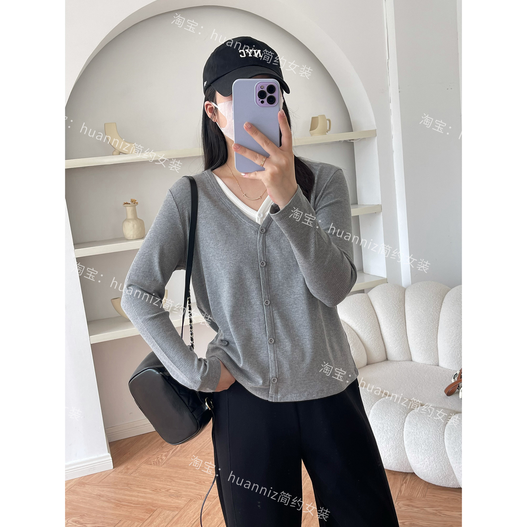 春装假两件T恤显瘦双层V领露锁骨单排扣正肩长袖弹力套头上衣女
