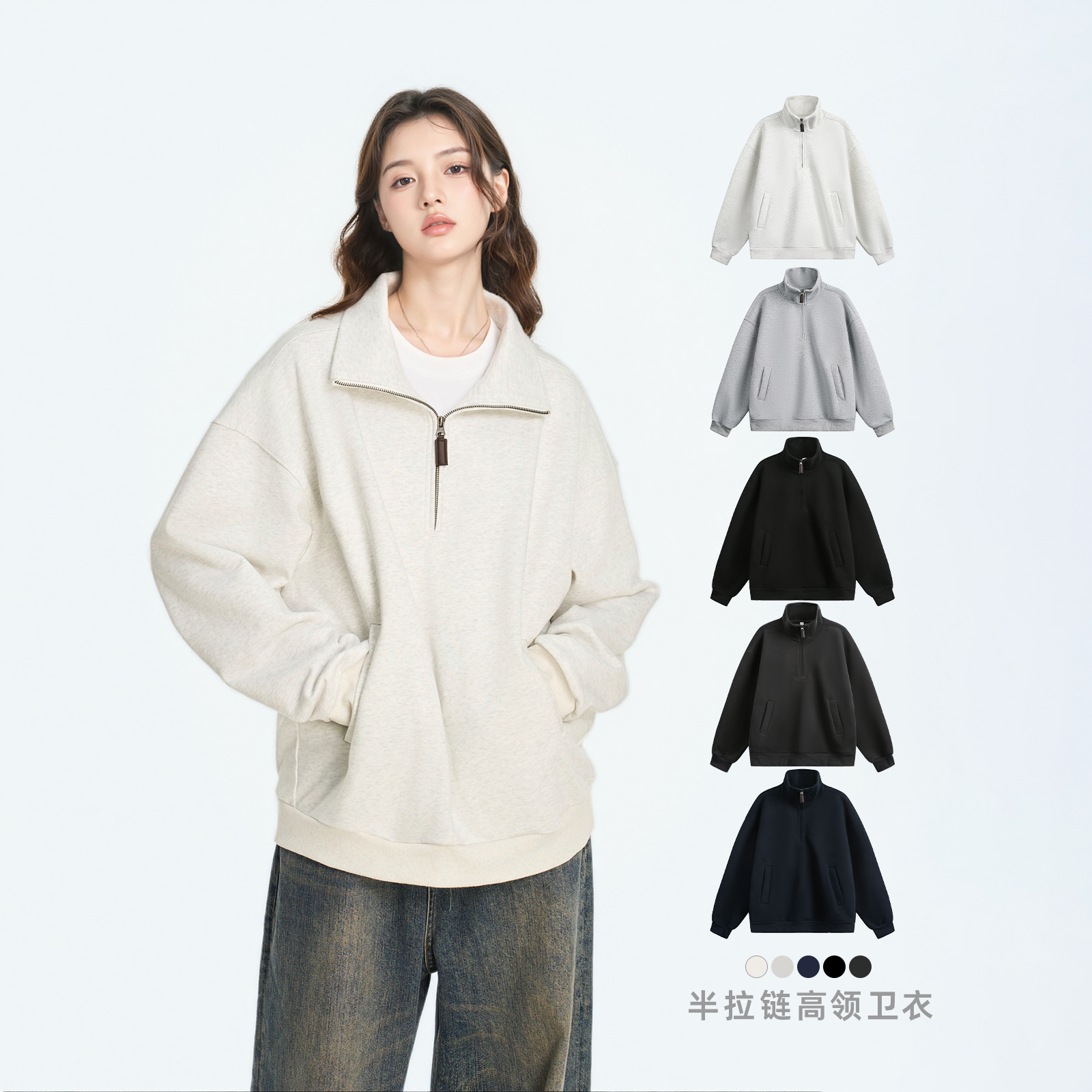 无帽半拉链高领卫衣女2025新款春季oversize纯色设计感情侣休闲