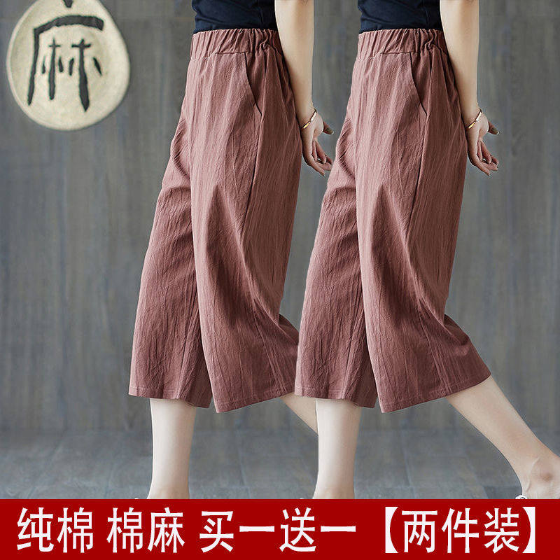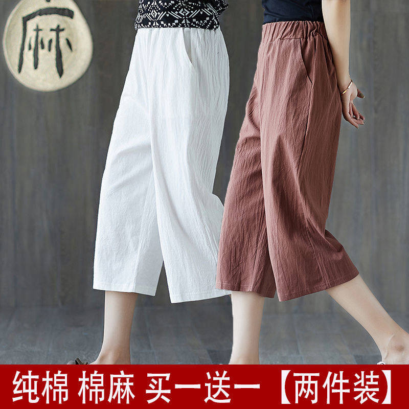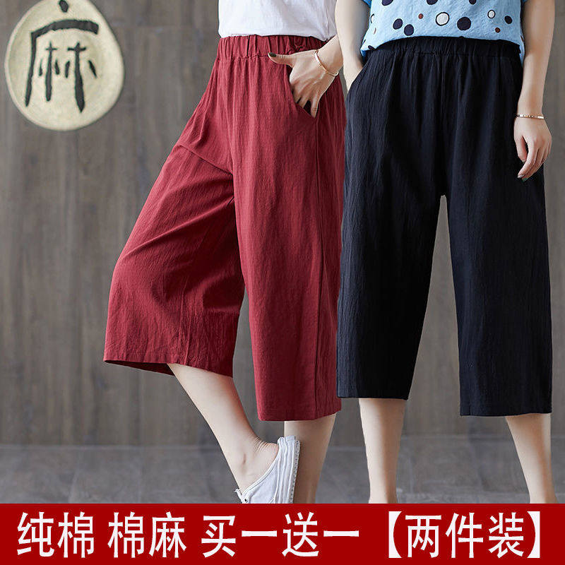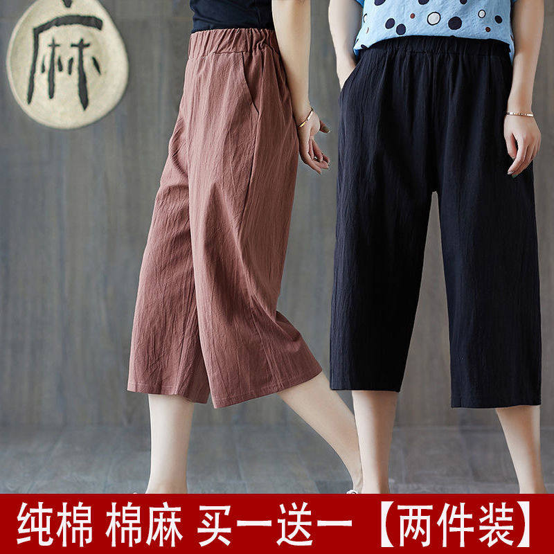 单/两件 棉质大码七分裤女2025夏季新款松紧高腰阔腿直筒休闲裤女