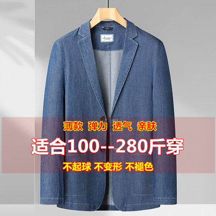 加肥加大码牛仔西装外套春季胖子休闲弹力西服薄款透气牛仔衣单西