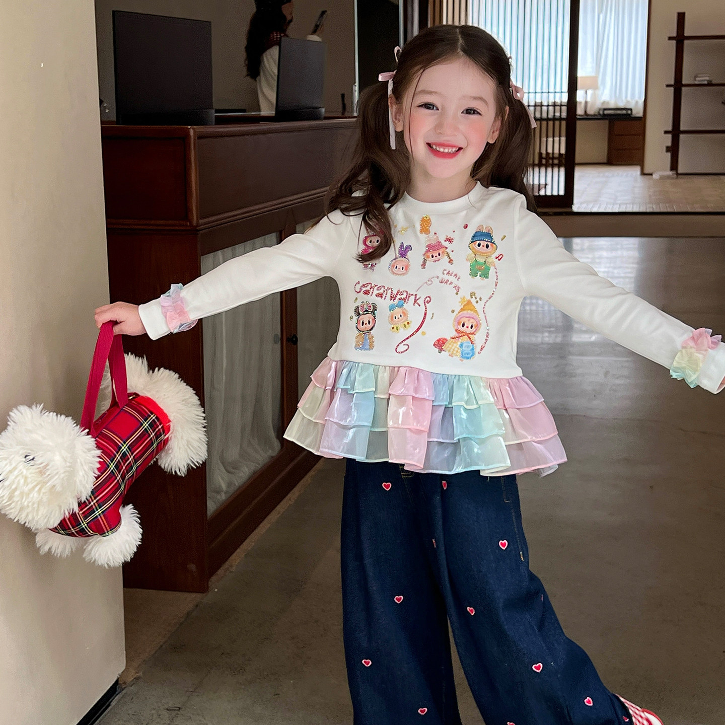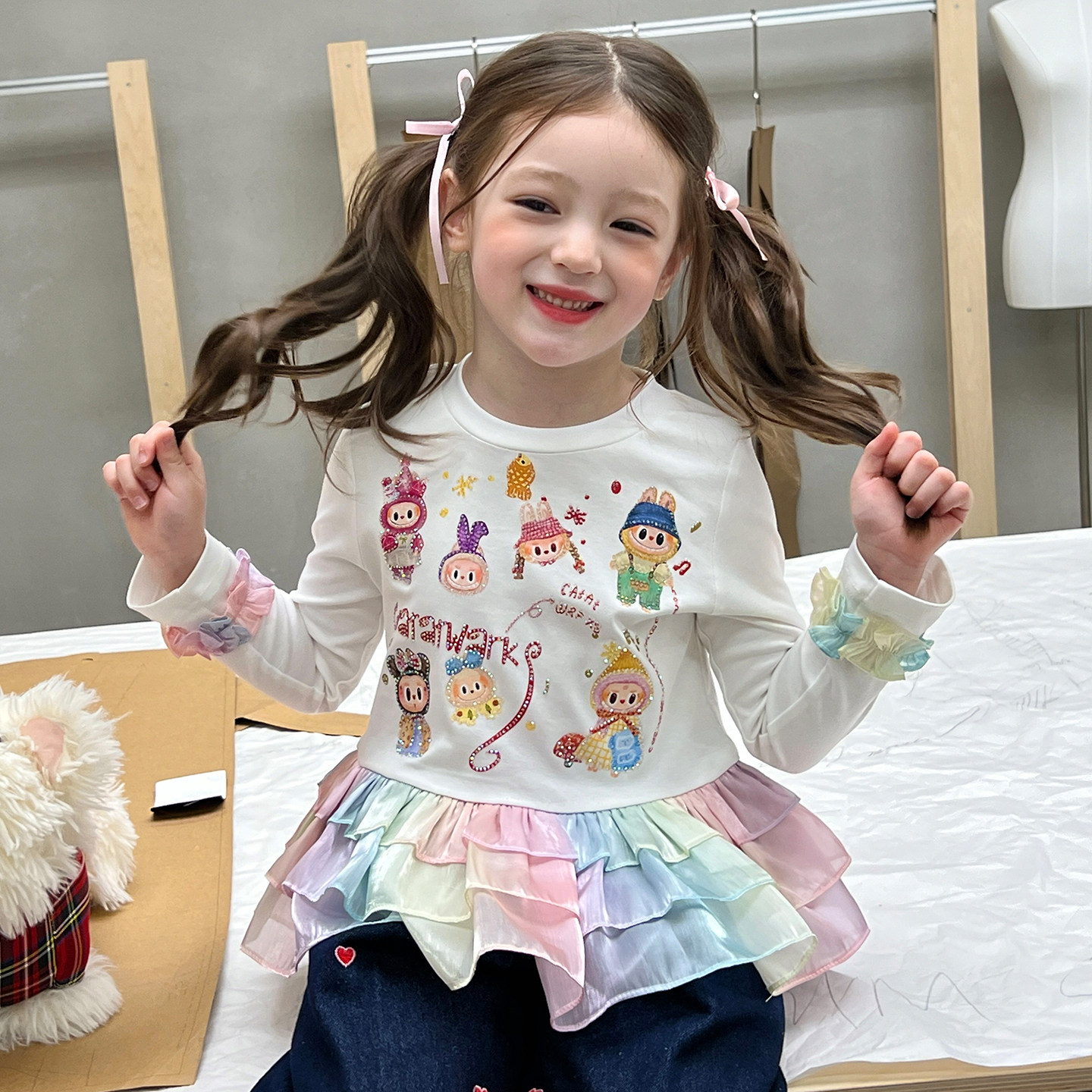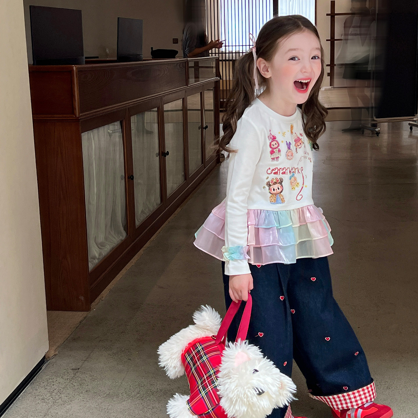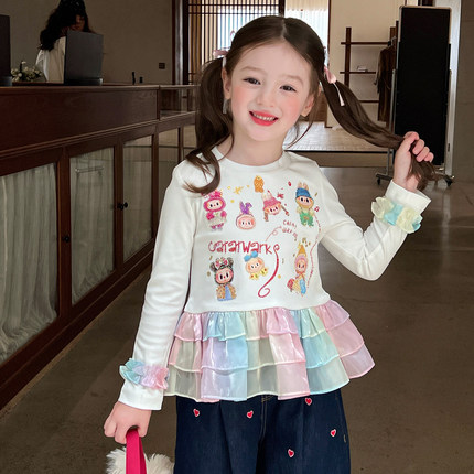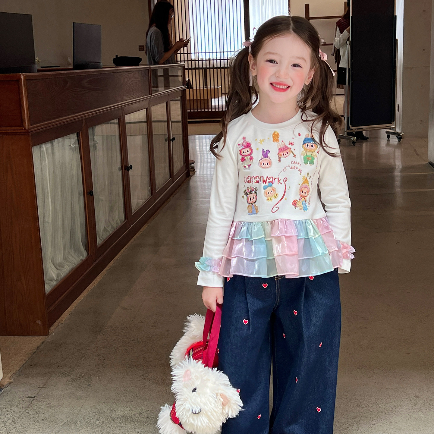 栀了成长记童装女童韩版印花烫钻上衣秋季儿童宝宝百搭荷叶边T恤