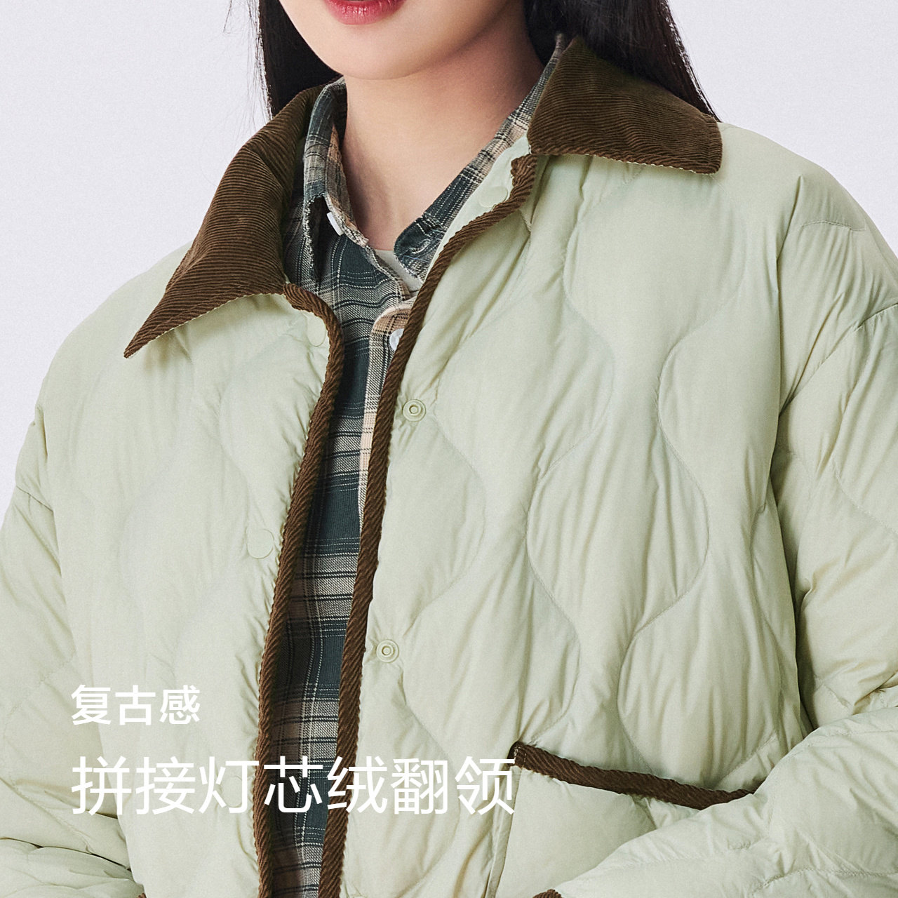 森马羽绒服女中长款轻薄拼接灯芯绒翻领2025冬季新款三防外套绿色