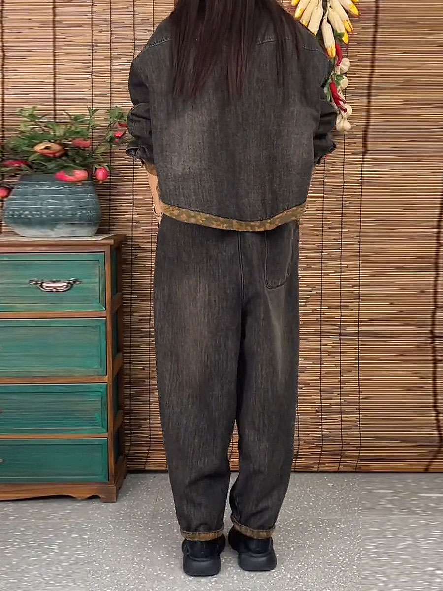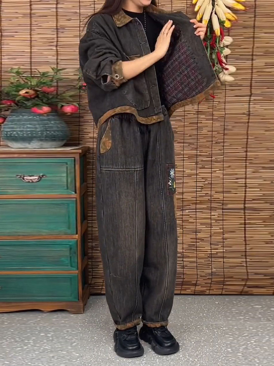 大码减龄加棉牛仔套装女秋冬新款宽松短上衣加绒哈伦裤两件套新款