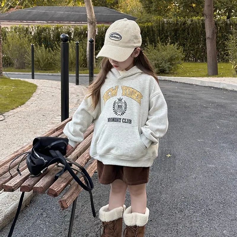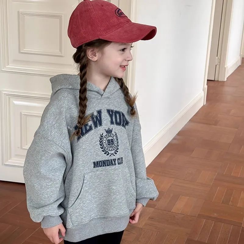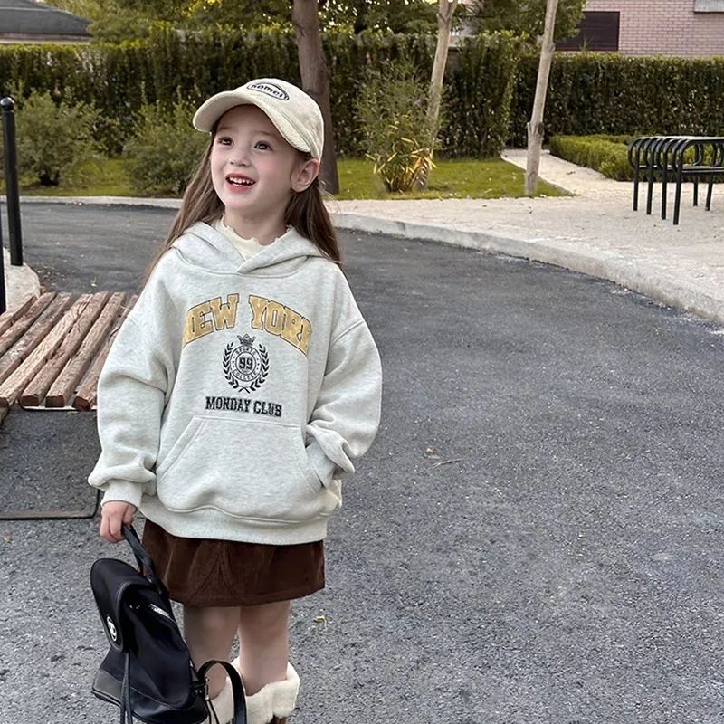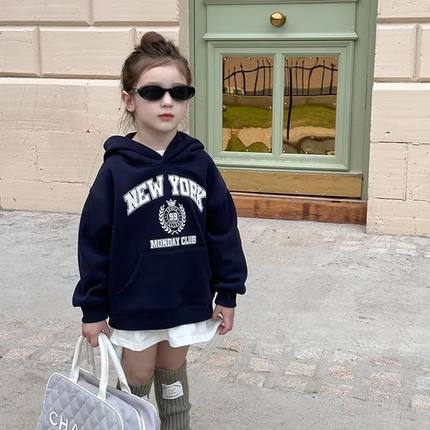 女童加绒卫衣秋冬新款韩版学院风儿童连帽上衣女宝冬季一体绒帽