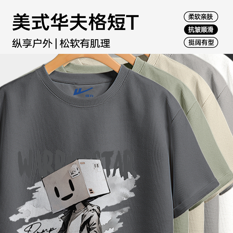 回力美式潮牌男士华夫格重磅短袖T恤夏季宽松大码圆领百搭半袖潮S