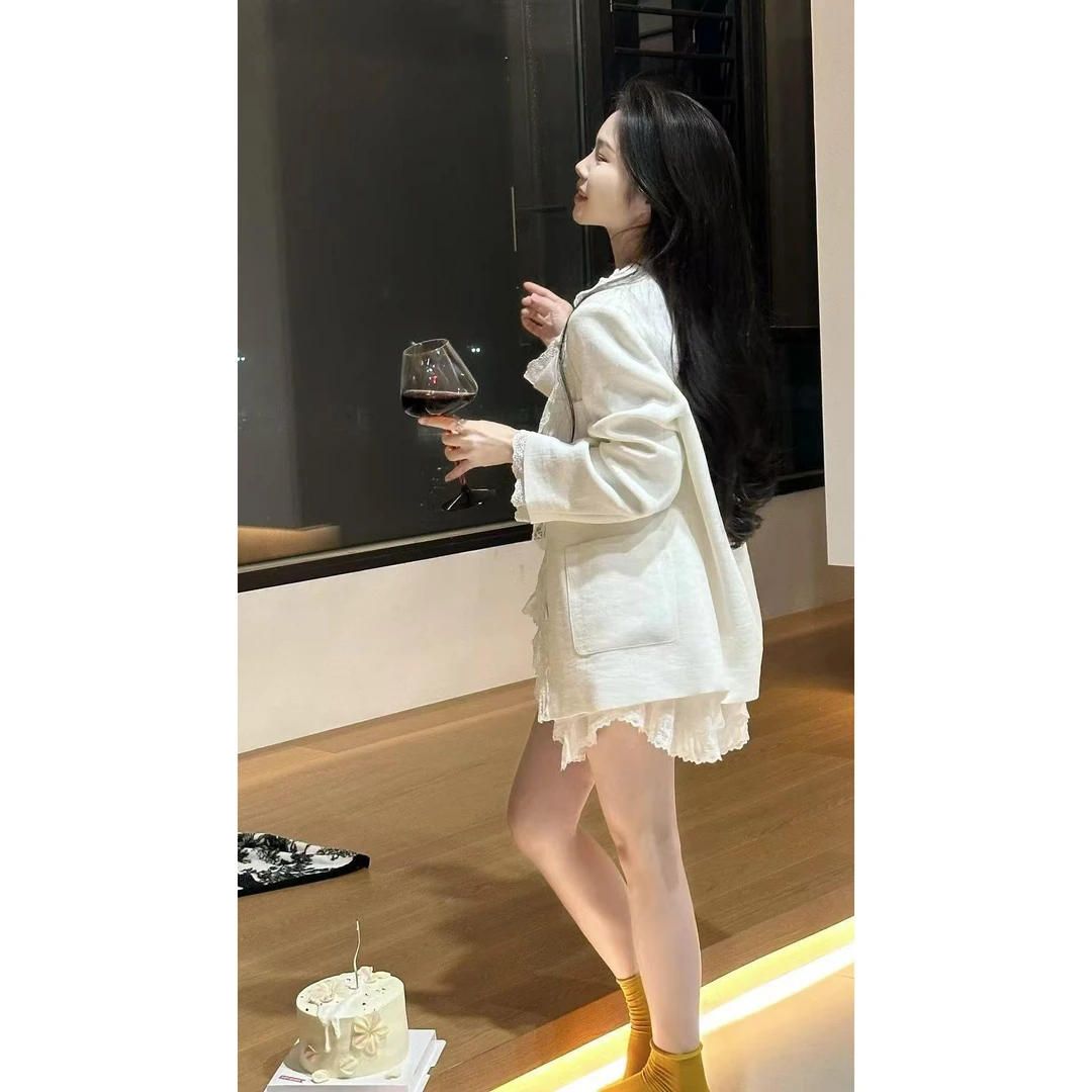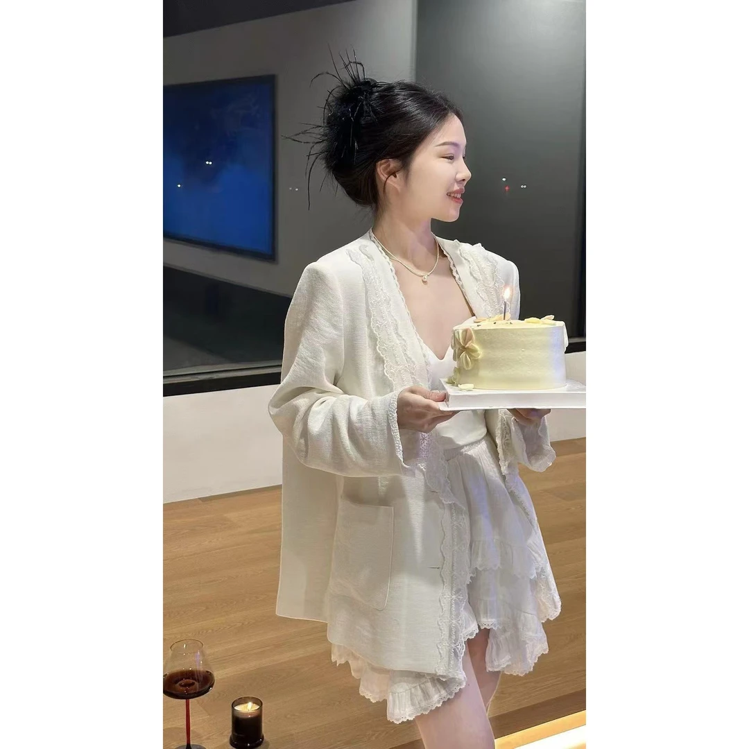 春秋季新款宽松慵懒风薄款西装长袖外套开衫蕾丝边半身裙套装女潮