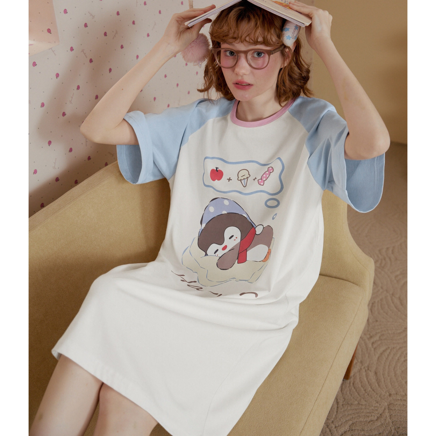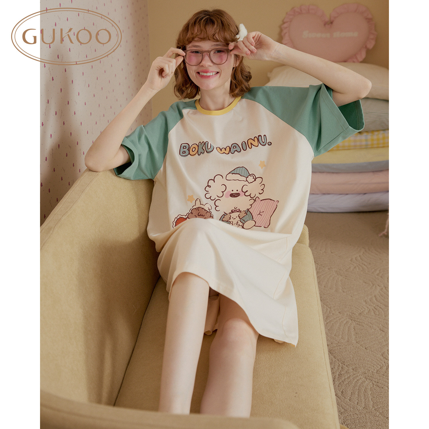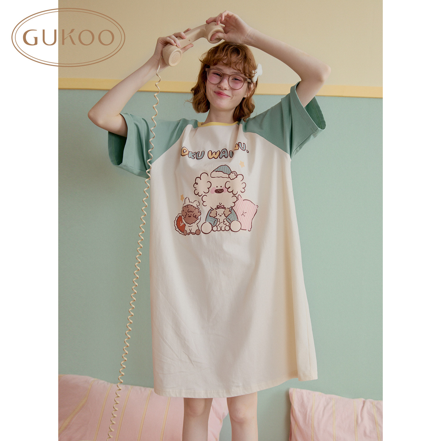 Gukoo/果壳短袖睡裙女春夏miiiiichan联名绿色休闲卡通居家睡衣