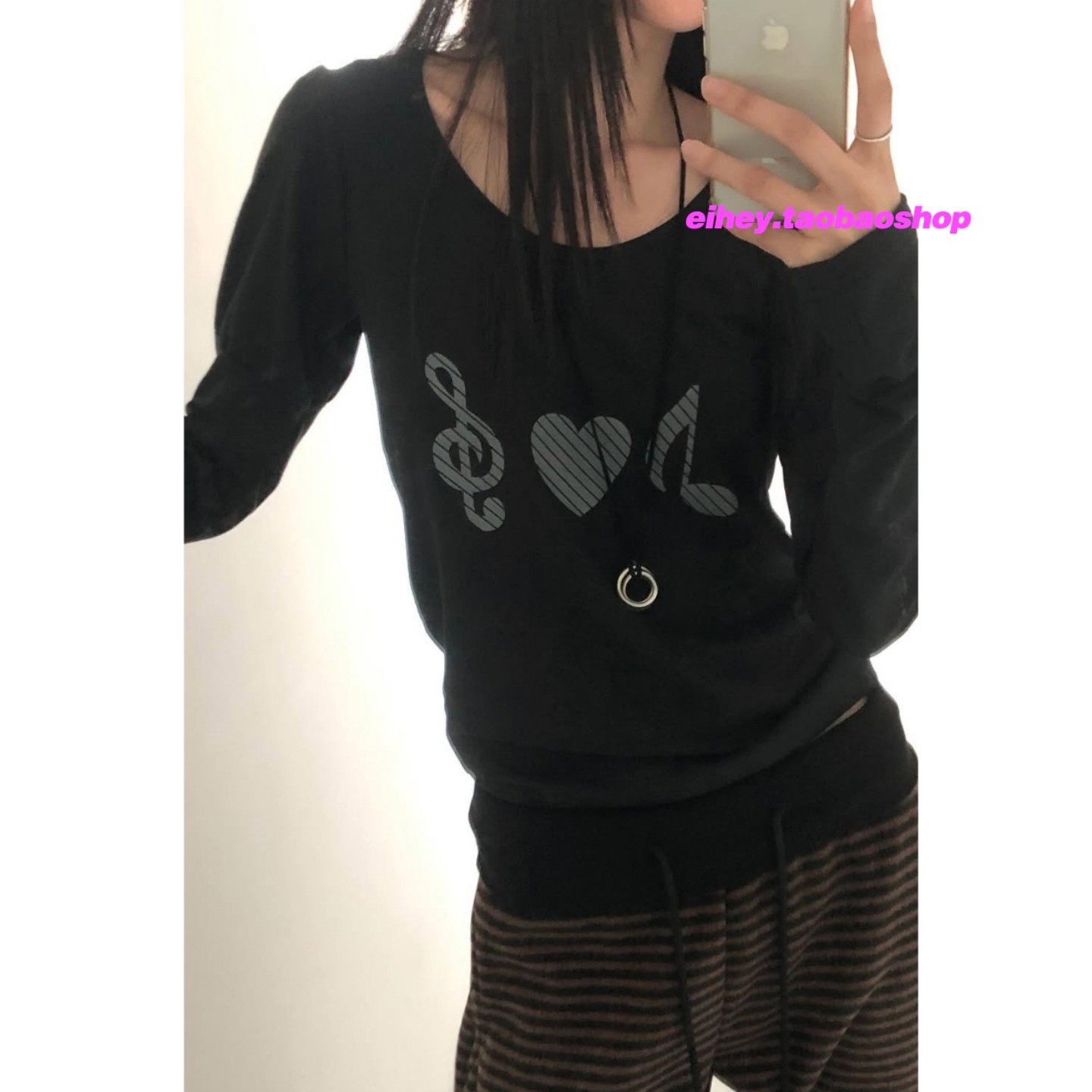 eihey诶嘿韩系简约百搭音符印花休闲圆领套头显瘦长袖T恤上衣女