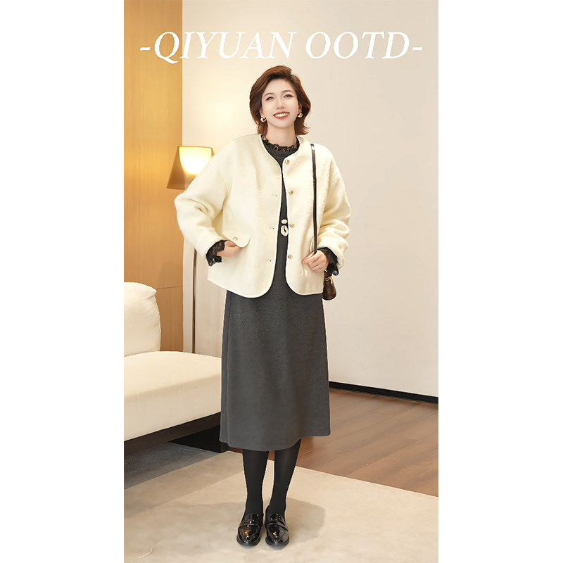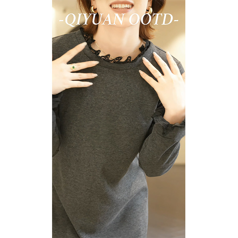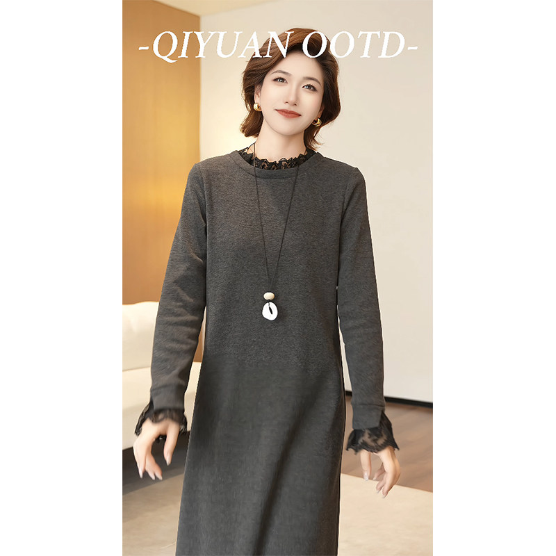 柒院家微胖大码拼接蕾丝圆领长袖连衣裙2025冬宽松遮肉显瘦中长裙