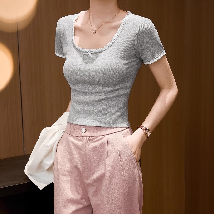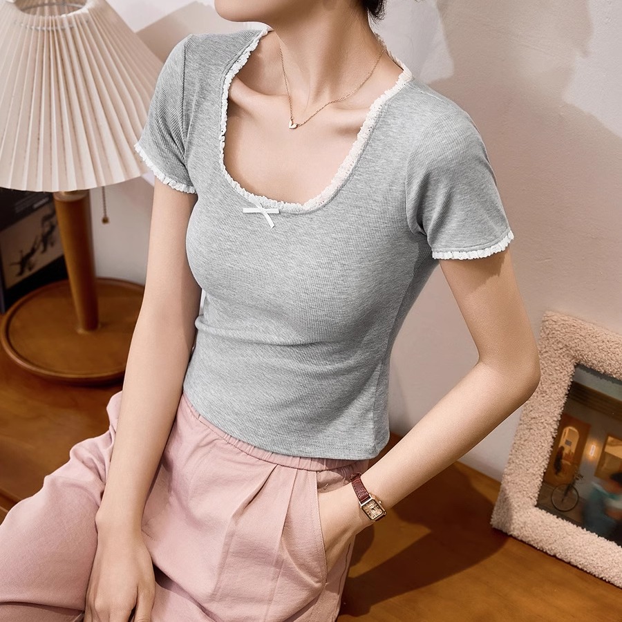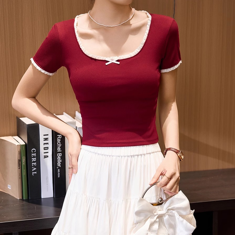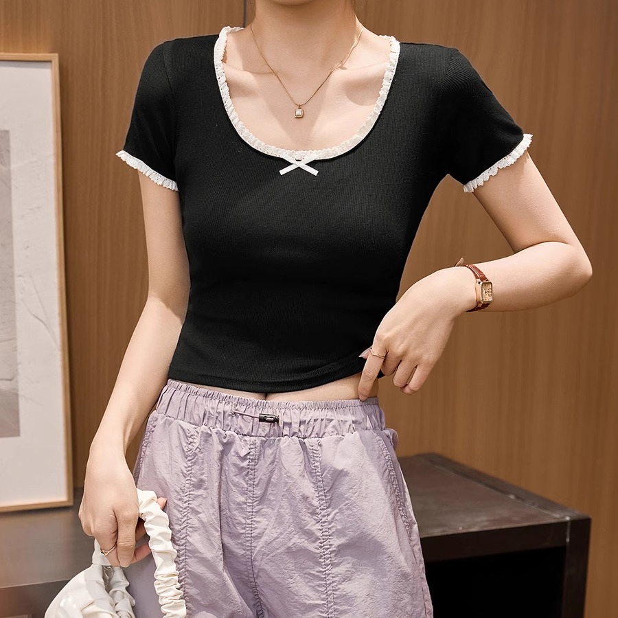 2025拼接蕾丝显瘦花边T恤女夏季新款U领蝴蝶结打底短袖撞色上衣女