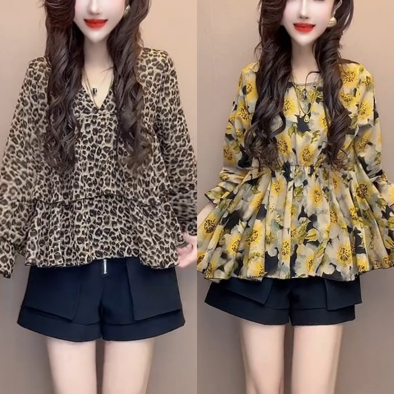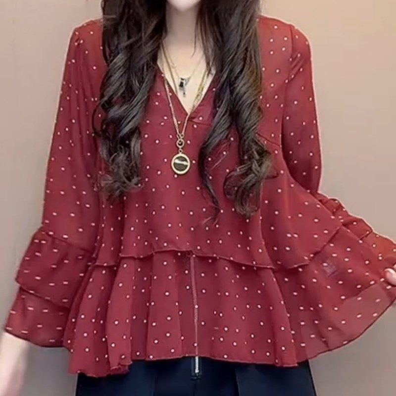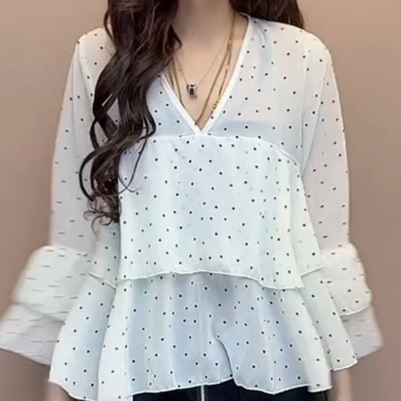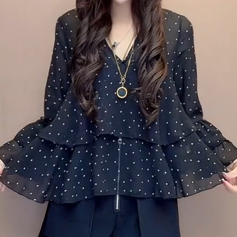 2025新款爆款百搭时尚大码洋气欧货波点雪纺衫韩系V领双层娃娃衫