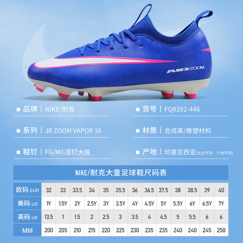 Nike耐克儿童足球鞋刺客VAPOR 16 FG/MG混钉青少年训练球鞋FQ8392