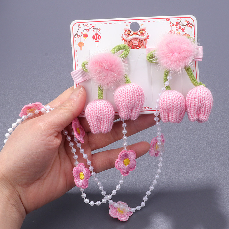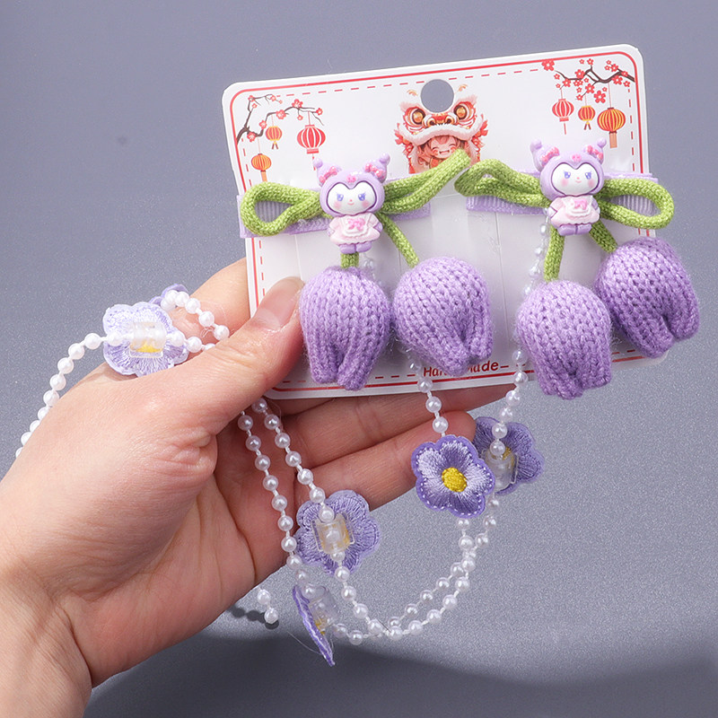 儿童针织花朵珍珠链条发带古风编发流苏库洛米发夹卡通小女孩发饰