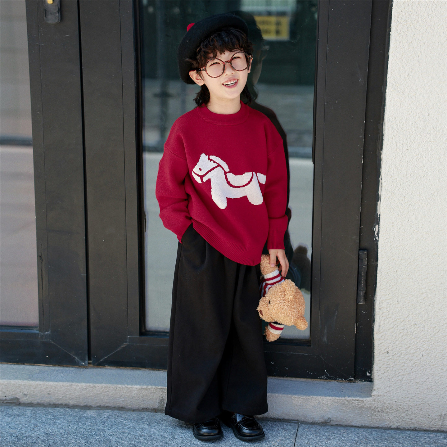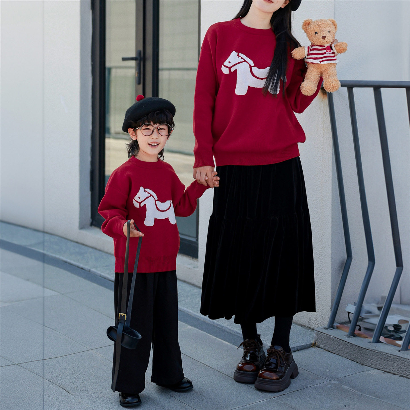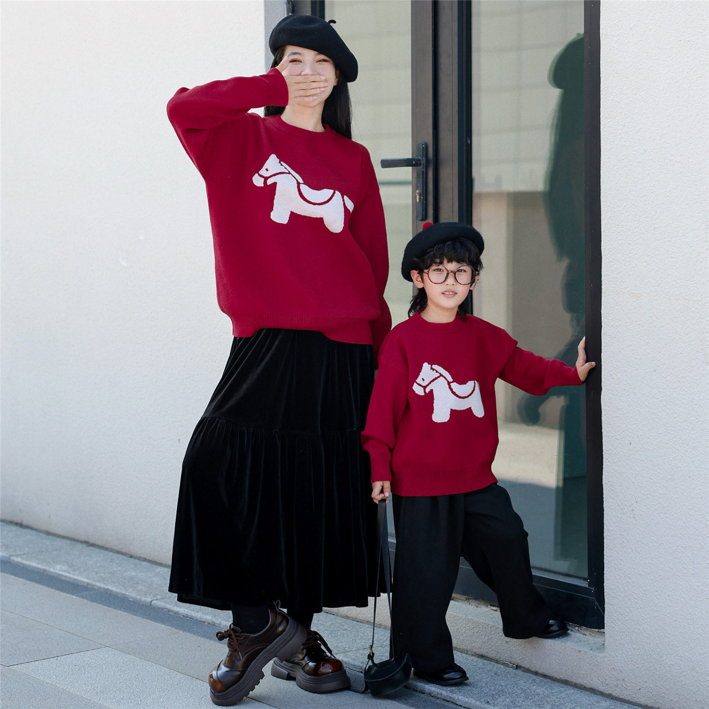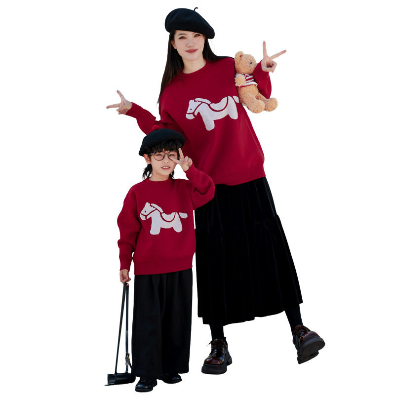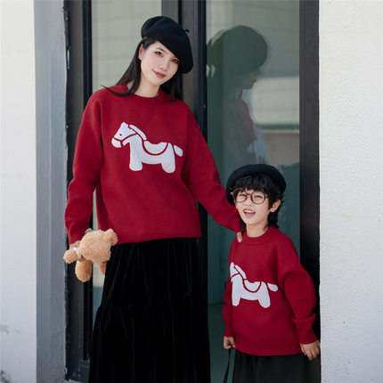 元旦新年装亲子毛衣红色小马图案母女母子亲子装秋冬柔软不扎人