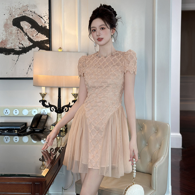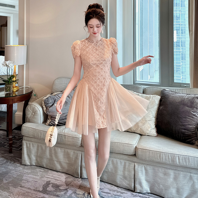 2025夏季新款女装甜美气质圆领收腰修身不规则a字粉色连衣裙15433