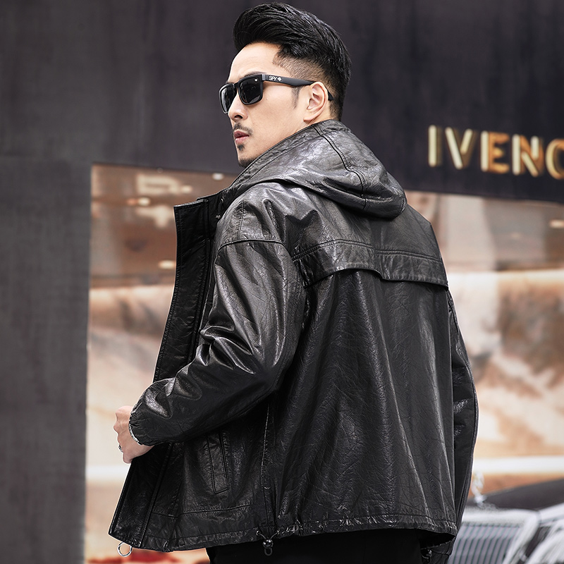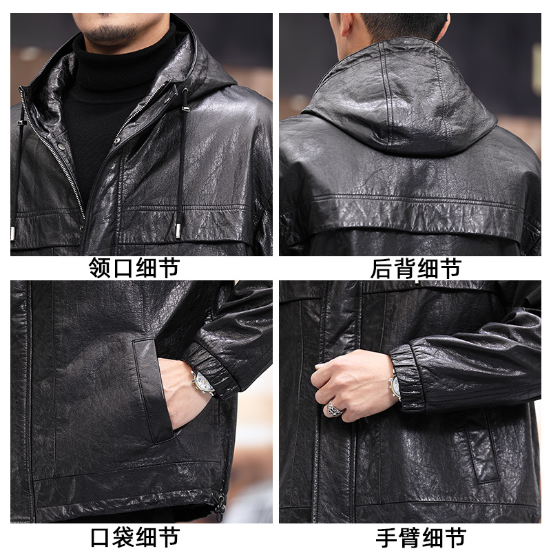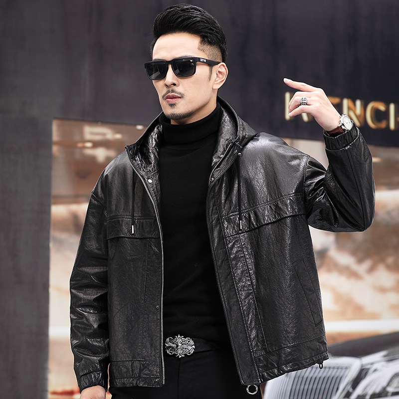 宽松阔版真皮皮衣男落肩袖短款连帽时尚休闲头层牛皮外套海宁夹克