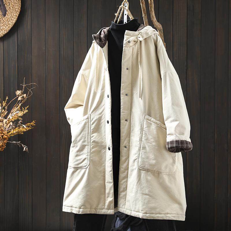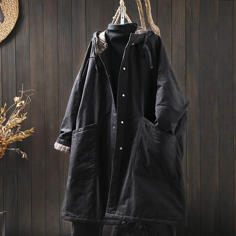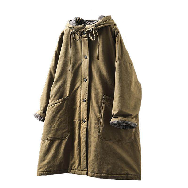 大口袋纯棉连帽中长款棉服外套女宽松大码冬复古休闲加厚保暖棉袄