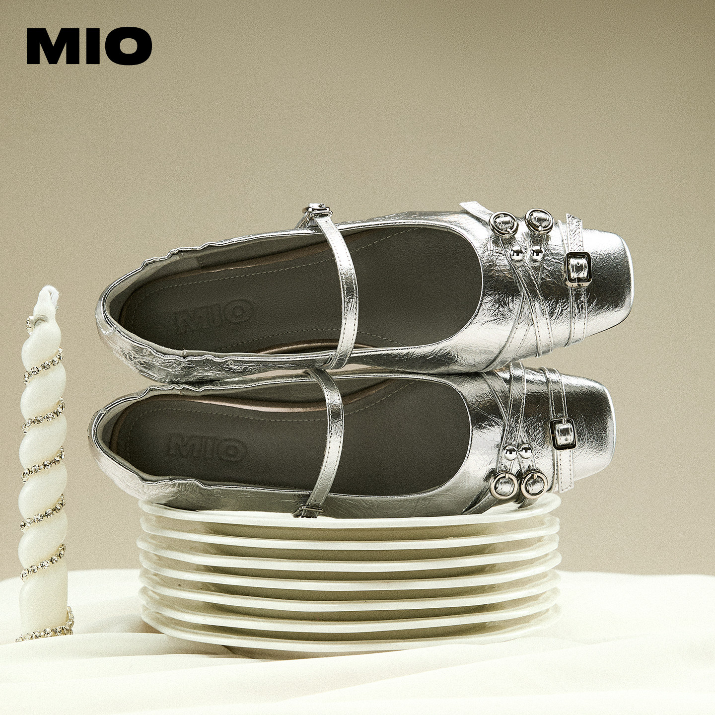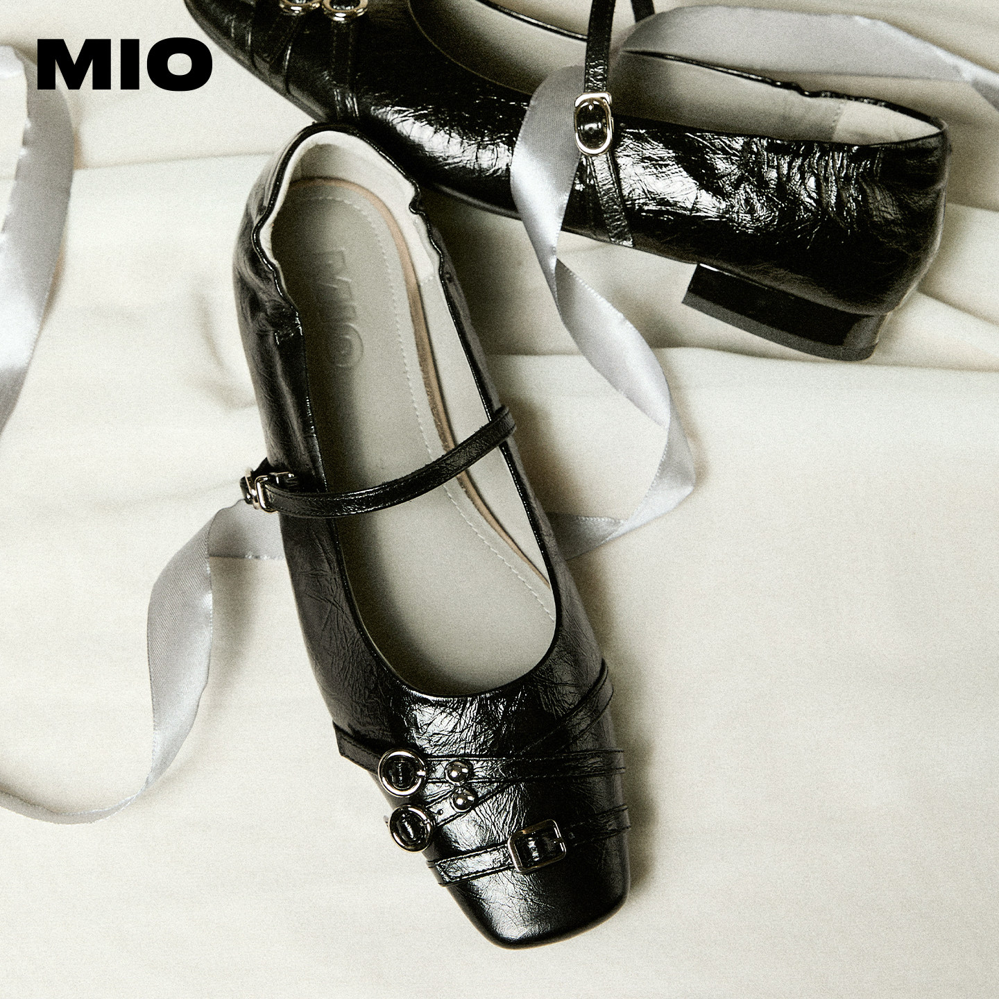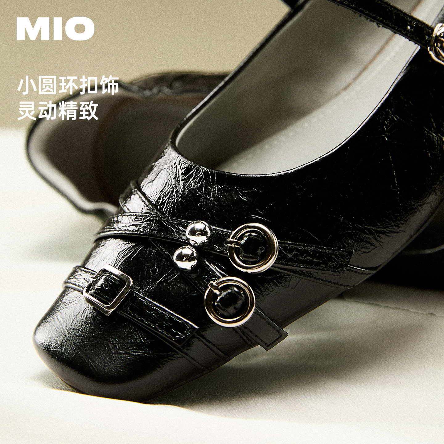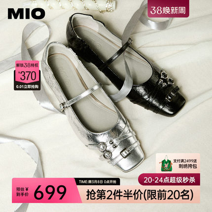 MIO米奥玛丽珍鞋春夏款一字扣带法式低跟方头银色浅口单鞋小皮鞋