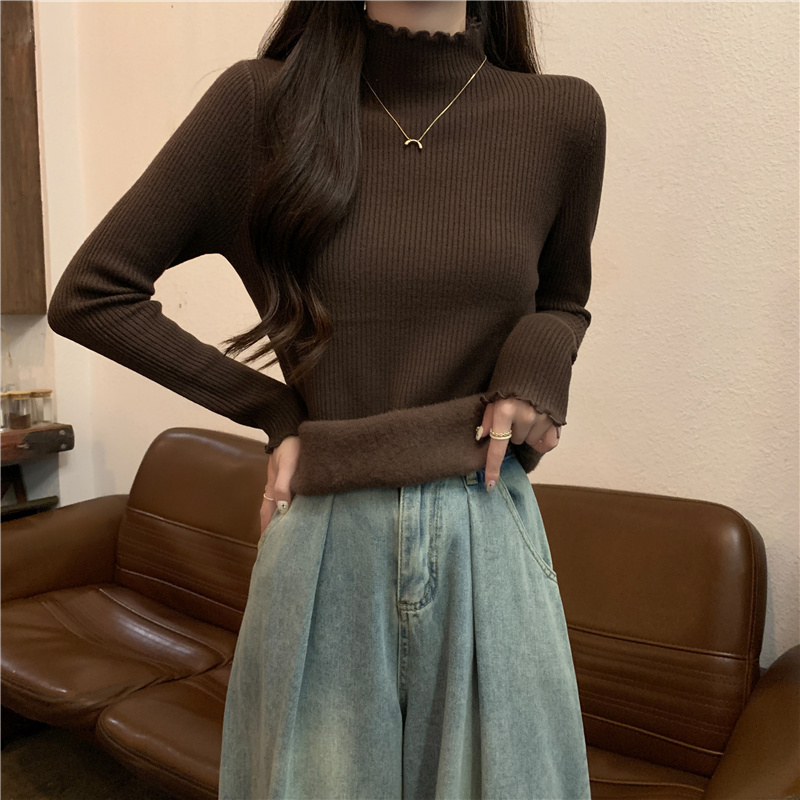 木耳边半高领长袖打底针织衫上衣秋冬季加厚一体绒保暖毛衣女内搭