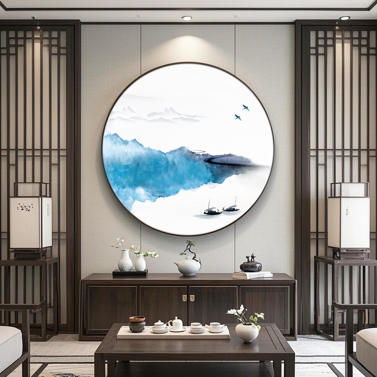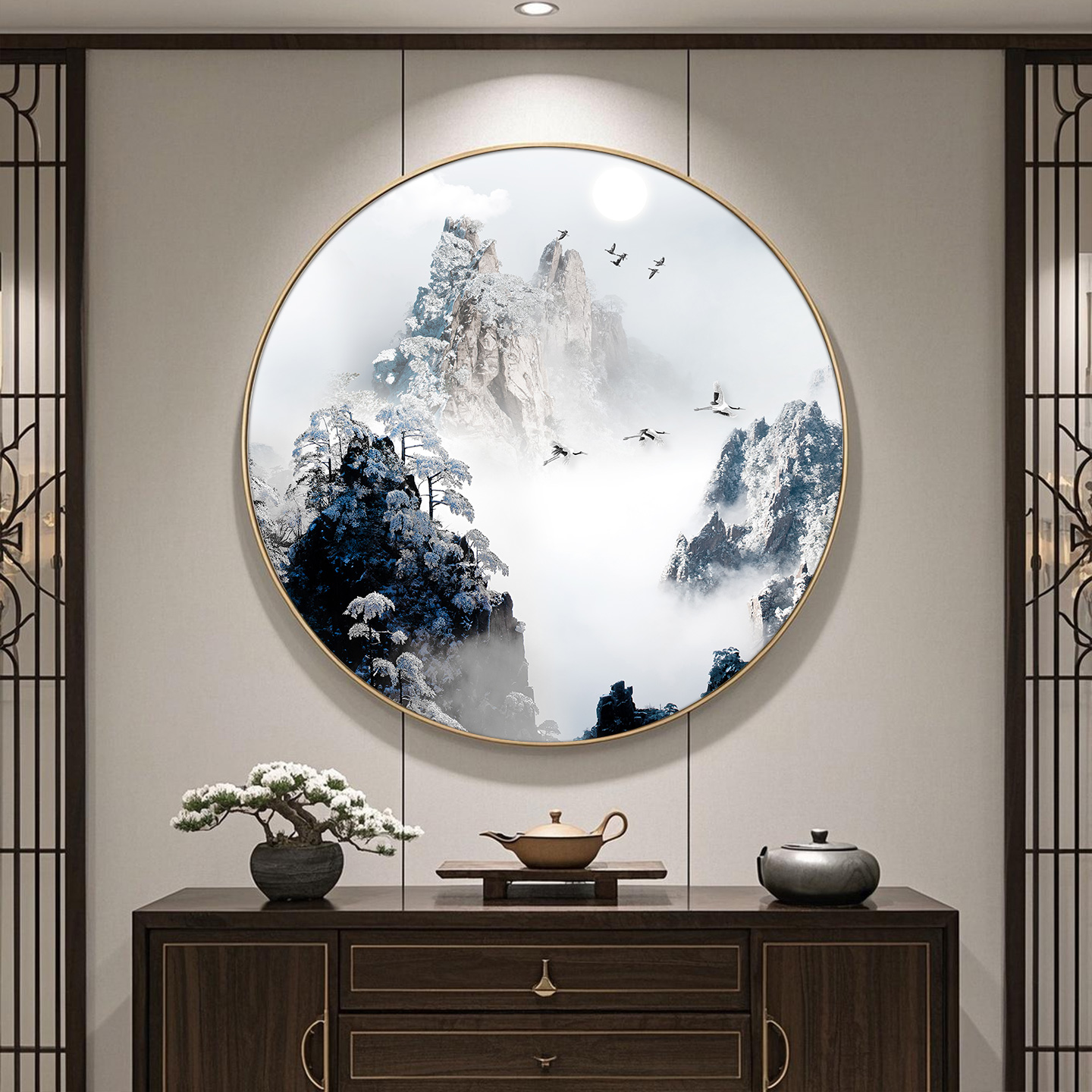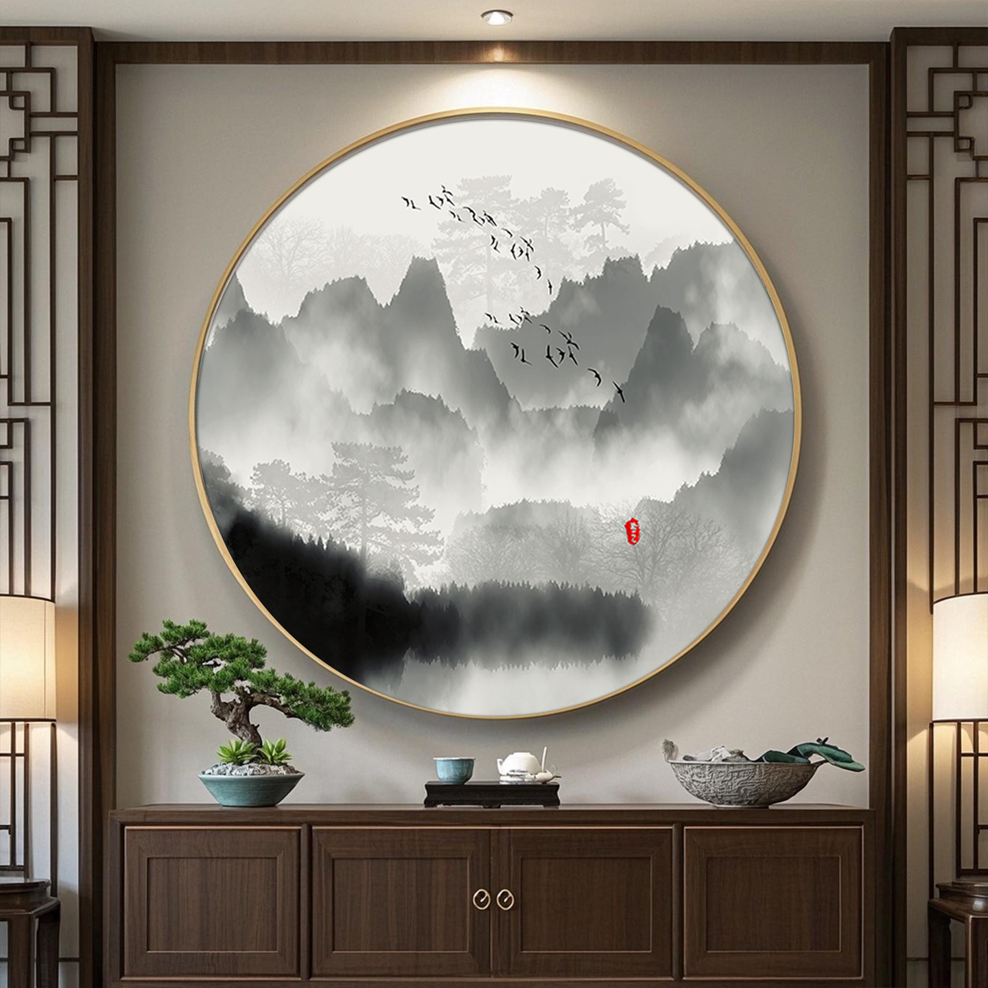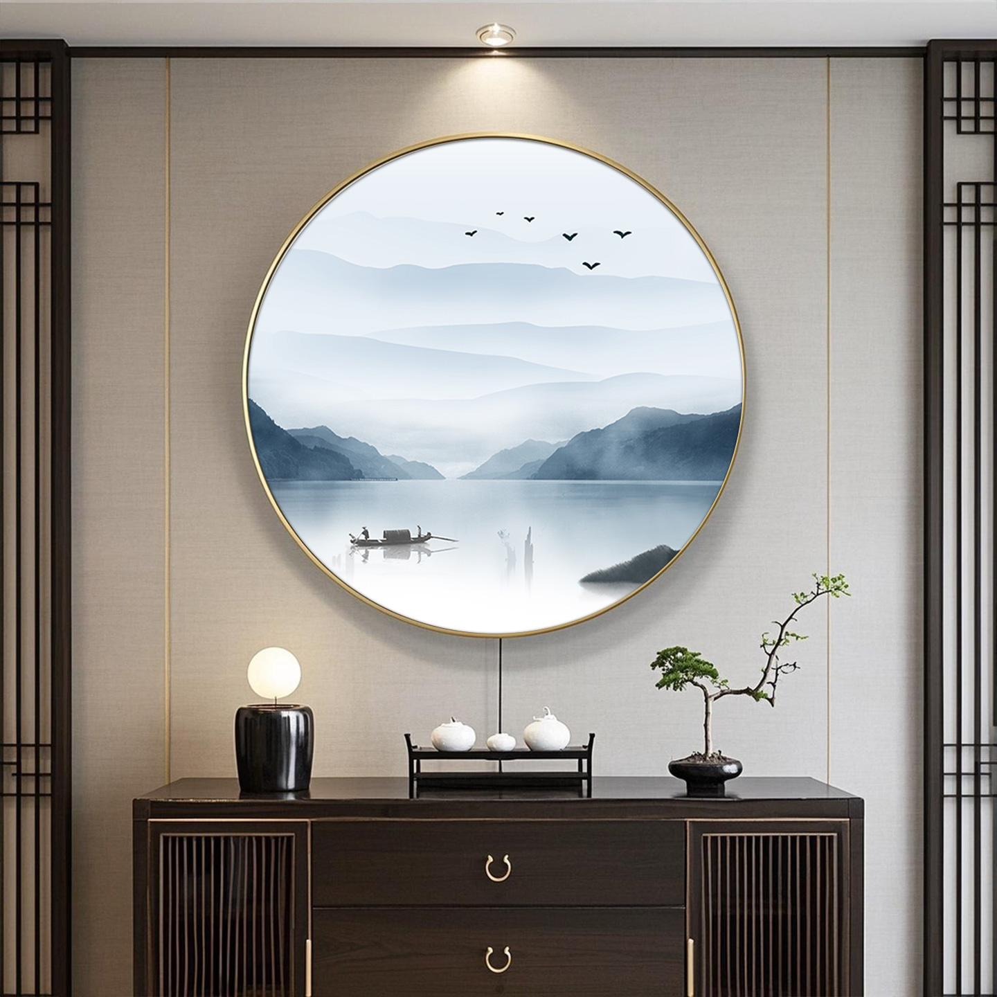 山水画新中式圆形挂画办公室玄关装饰画茶室水墨画禅意背景墙壁画