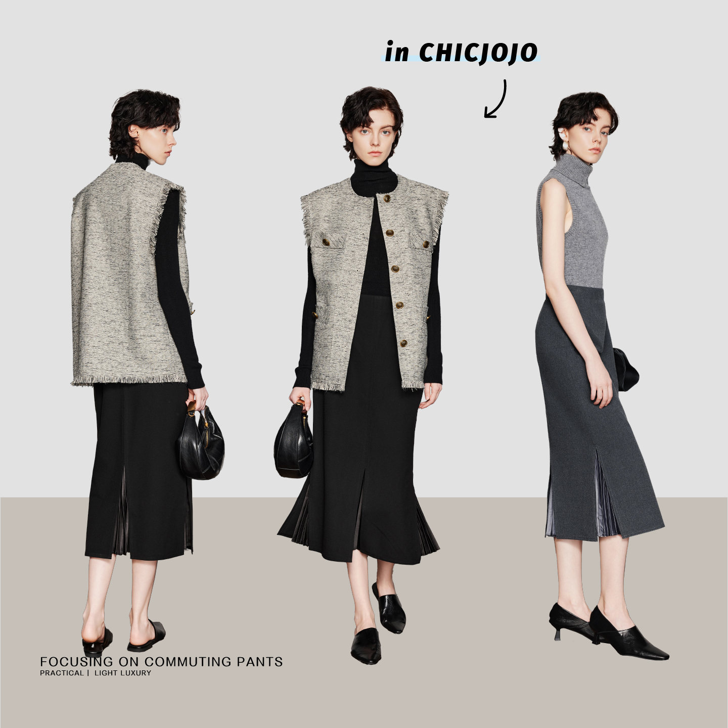 CHICJOJO百褶毛呢拼接鱼尾半身裙