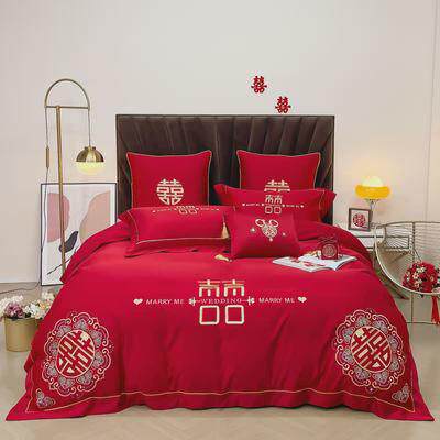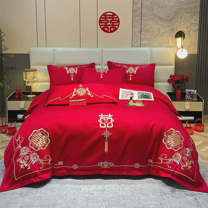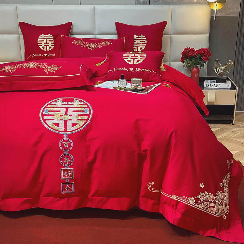 婚庆四件套大红简约刺绣结婚房嫁礼喜庆被套床单笠欧式床上用新品