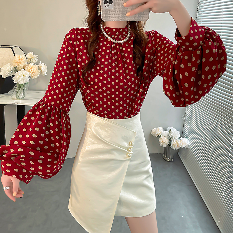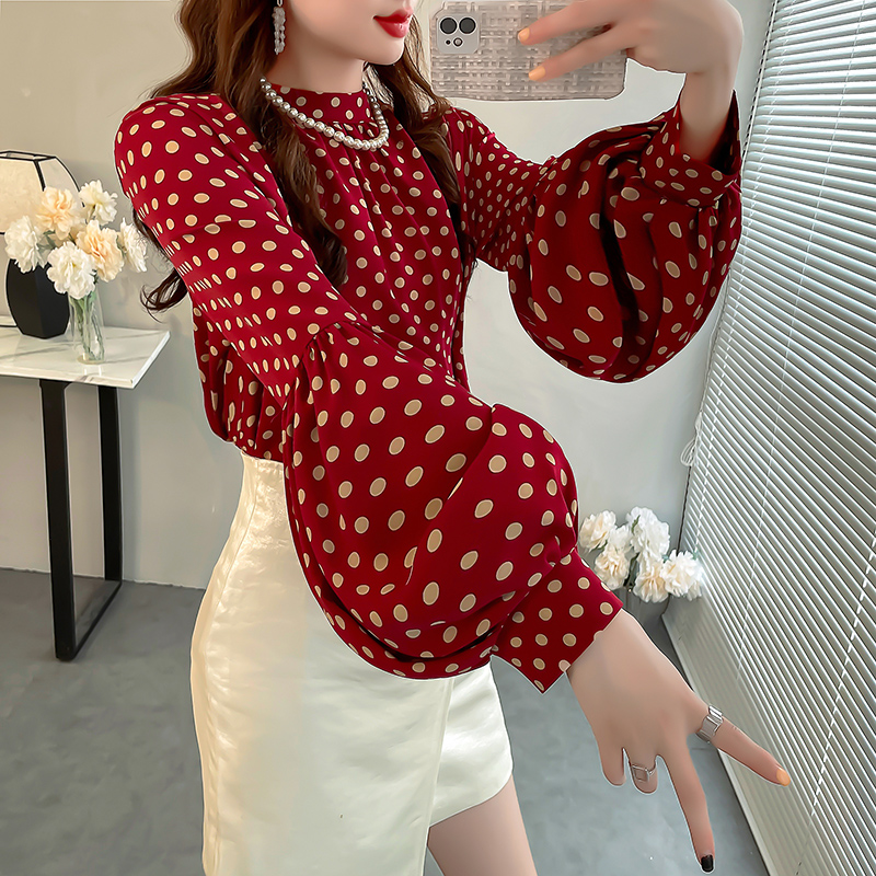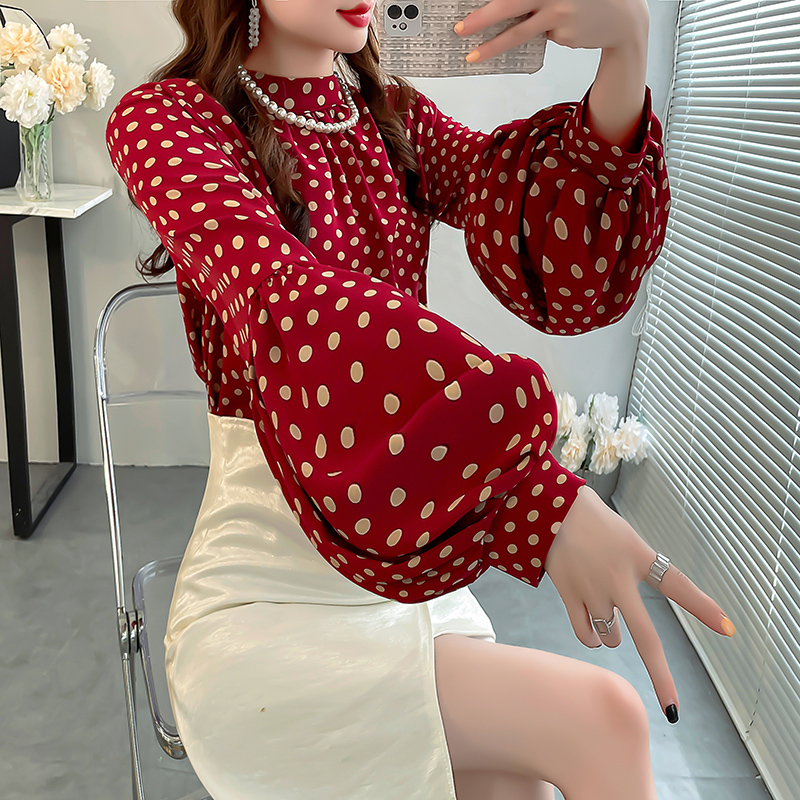 甜美波点印花衬衫女款2025新款雪纺衬衣洋气显瘦灯笼袖立领上衣秋