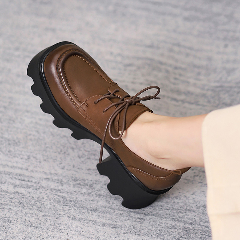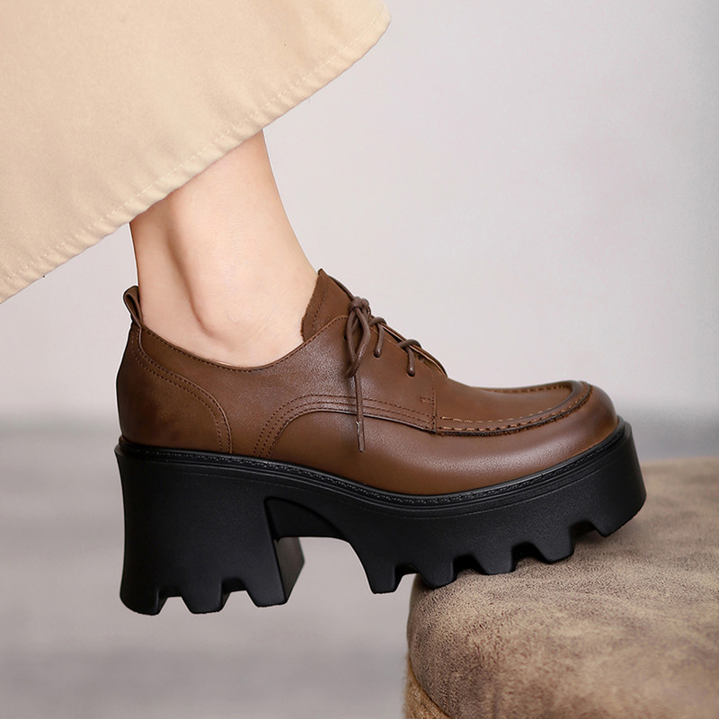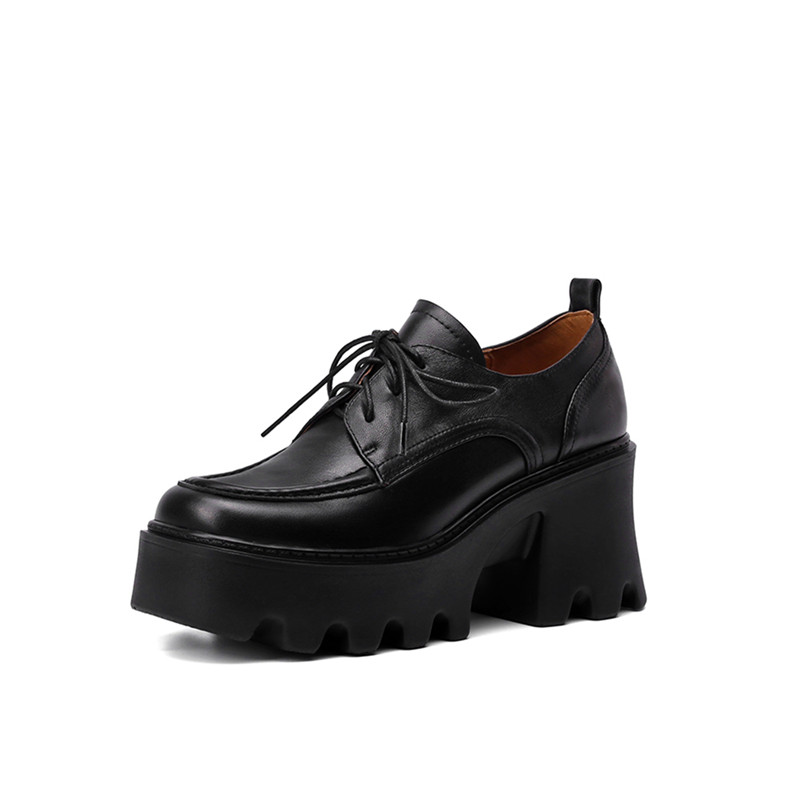2025春新款真皮厚底系带复古小皮鞋女粗跟防水台圆头黑色高跟单鞋