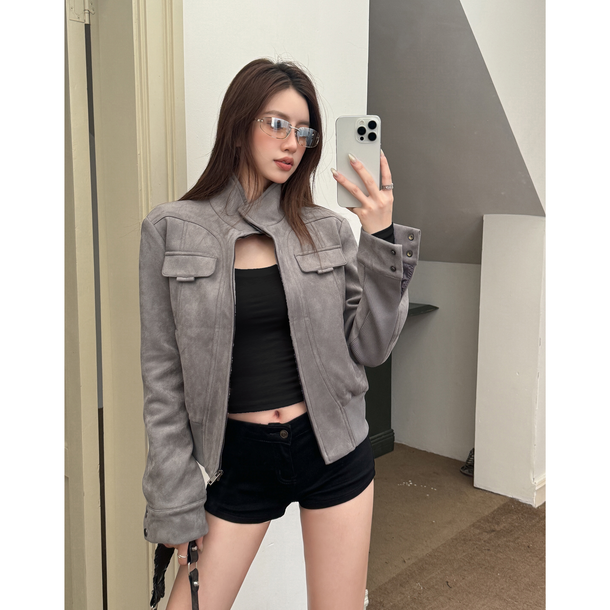 浅布调秋冬复古麂皮绒短外套短款立领夹克外套女韩系休闲修身上衣