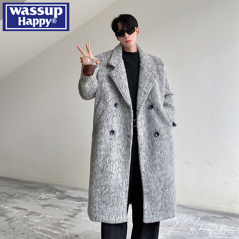 wassup happy灰色毛呢大衣男士冬季加厚高级感风衣中长款休闲外套