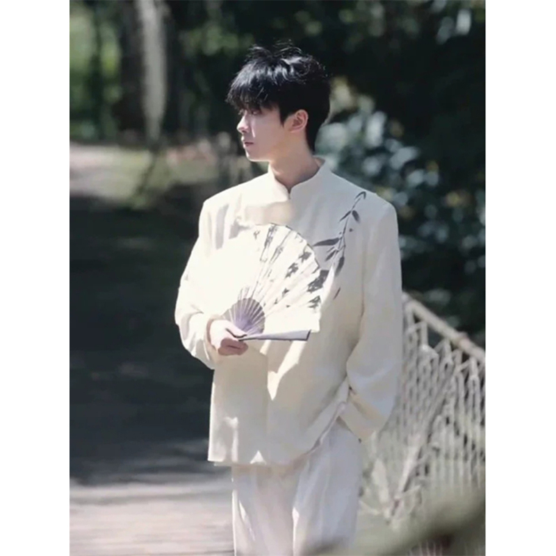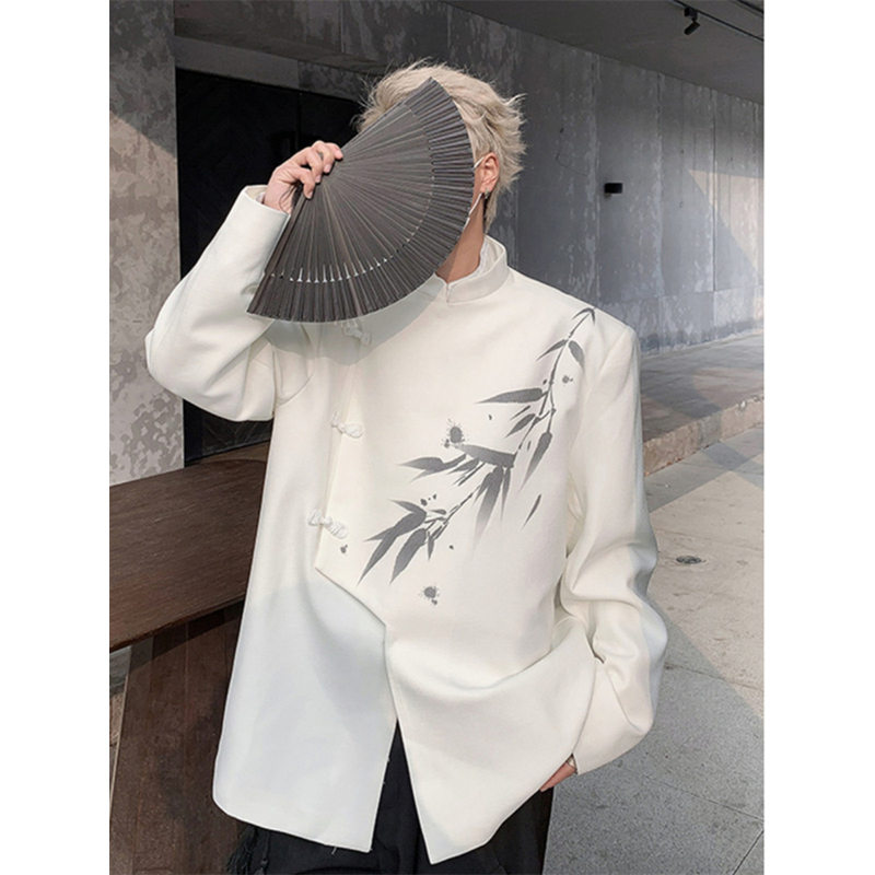 轻奢新中式男秋季国风白色小西服高级感痞帅中山装水墨竹盘扣套装