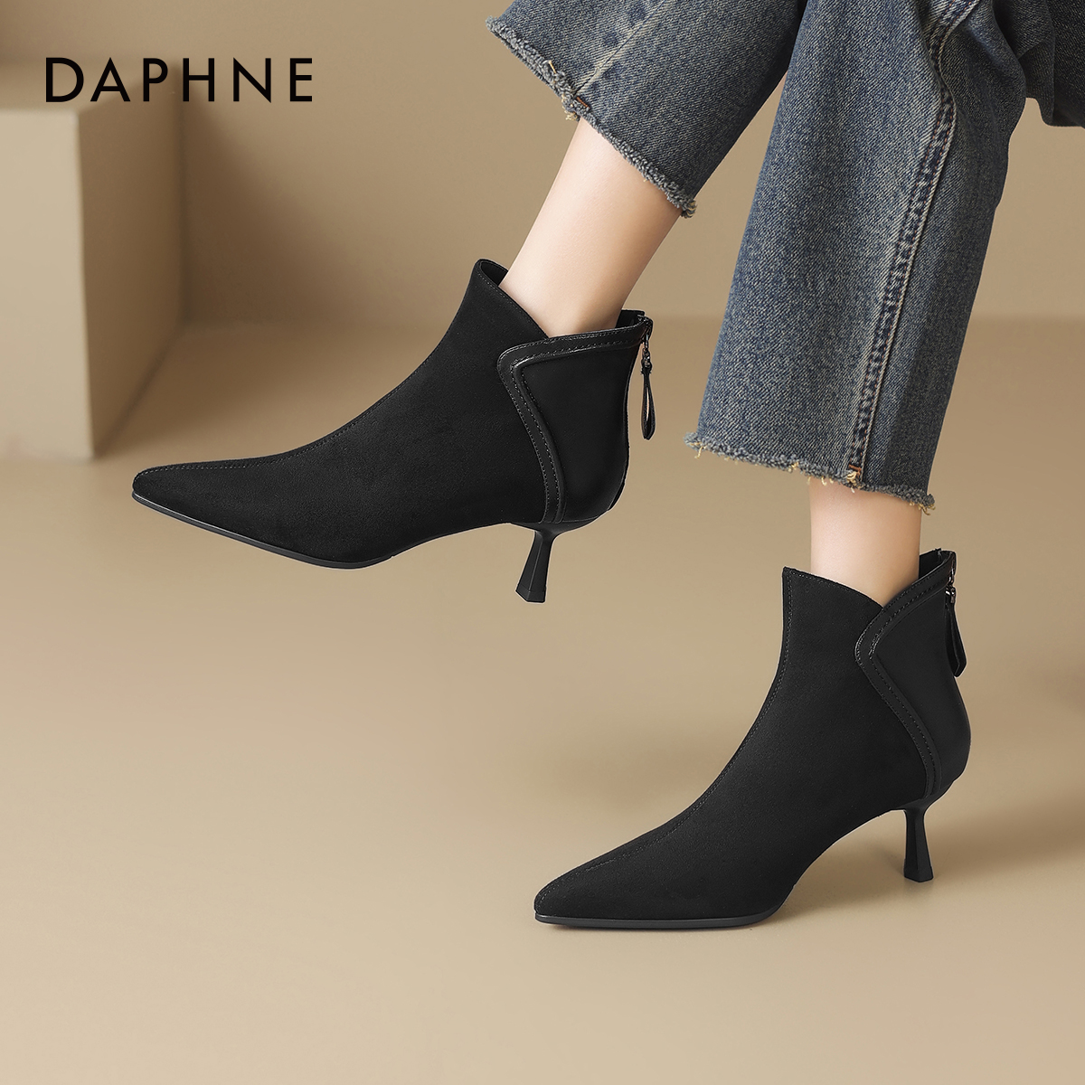 达芙妮尖头短靴女法式小踝靴高跟